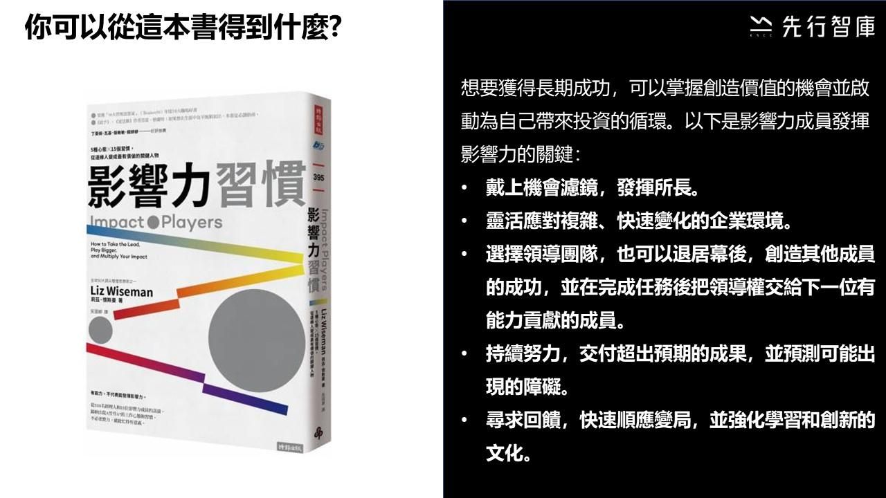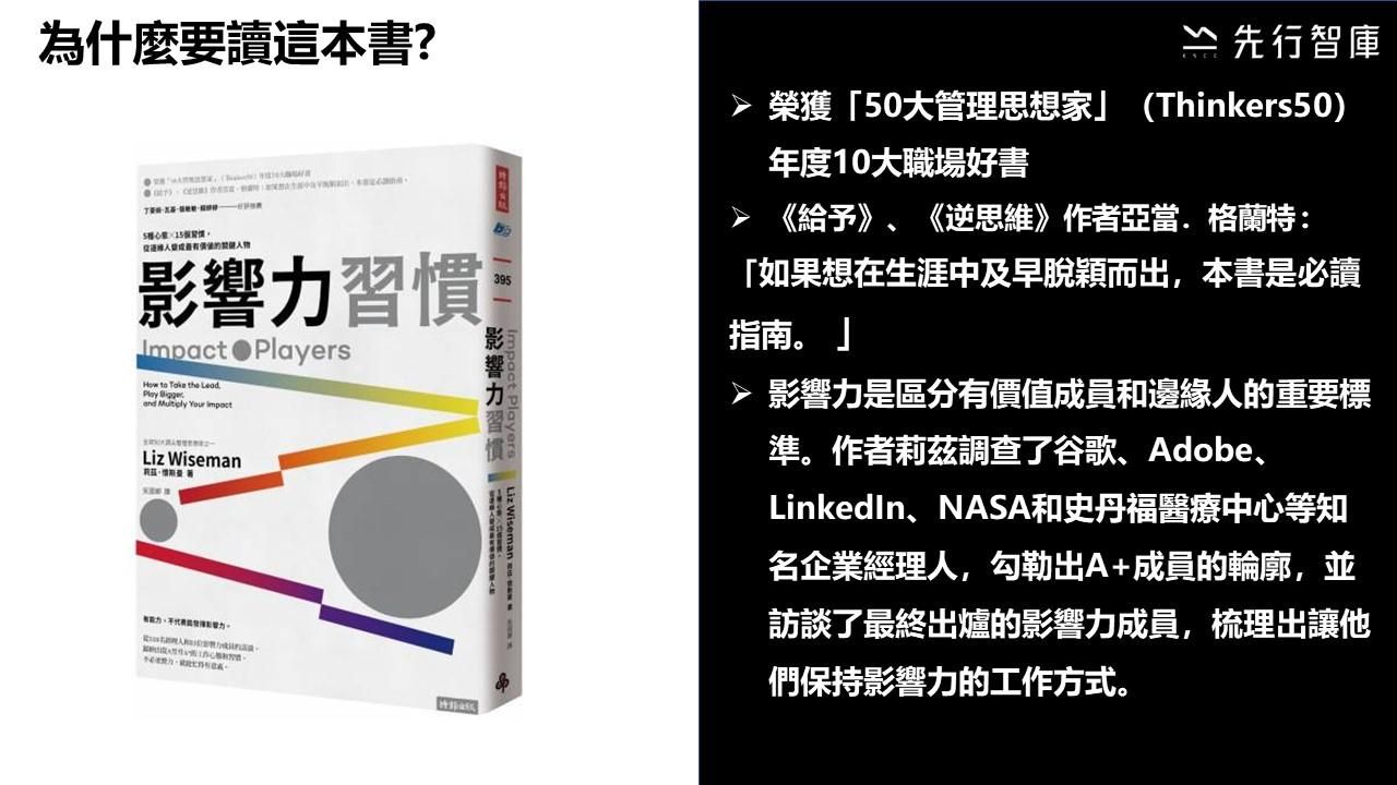 這本書《影響力習慣》(Impact Players)介紹了如何在工作中脫穎而出,成為具備影響力的關鍵人物,主要針對那些希望在職場上不斷成長、提升自己價值的人士。