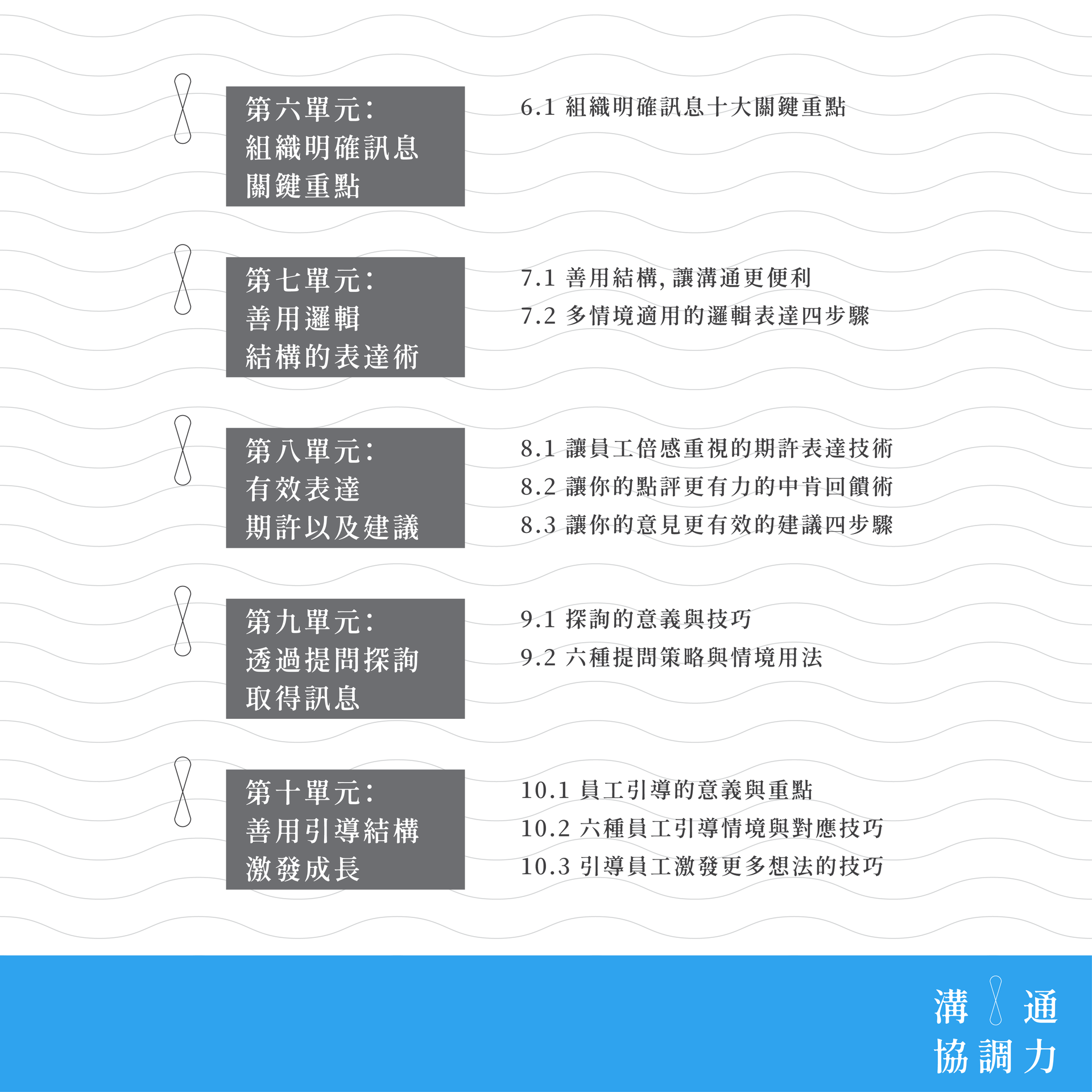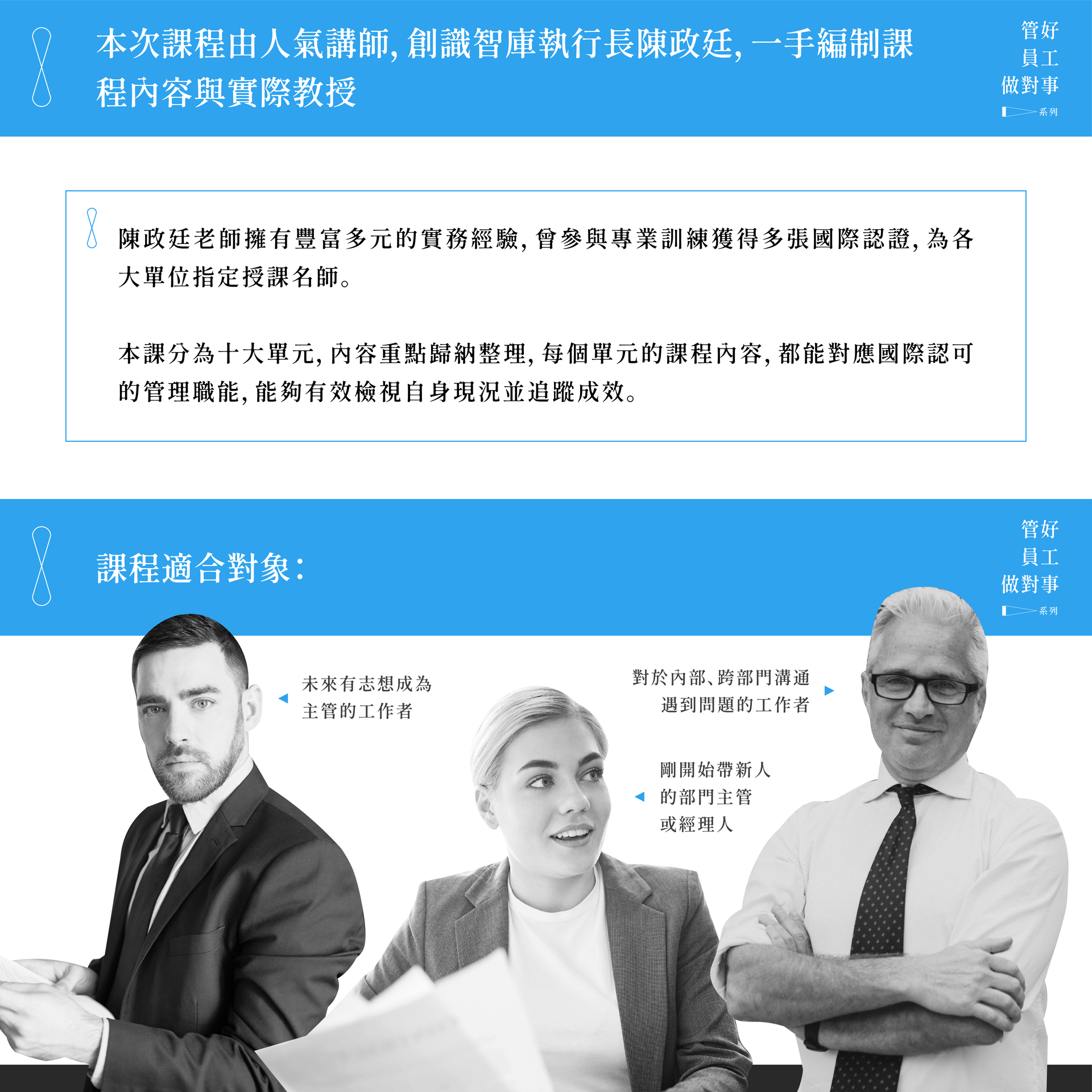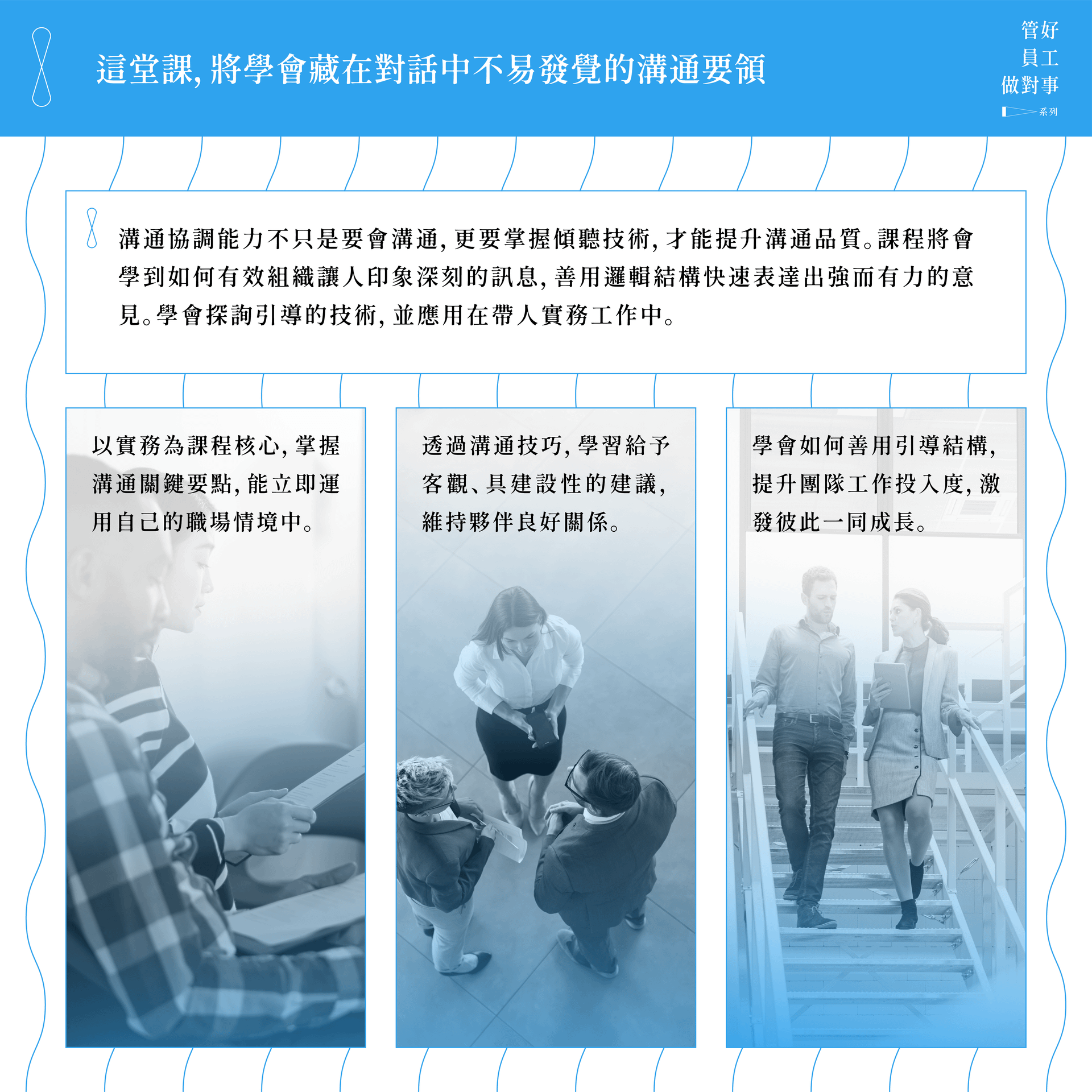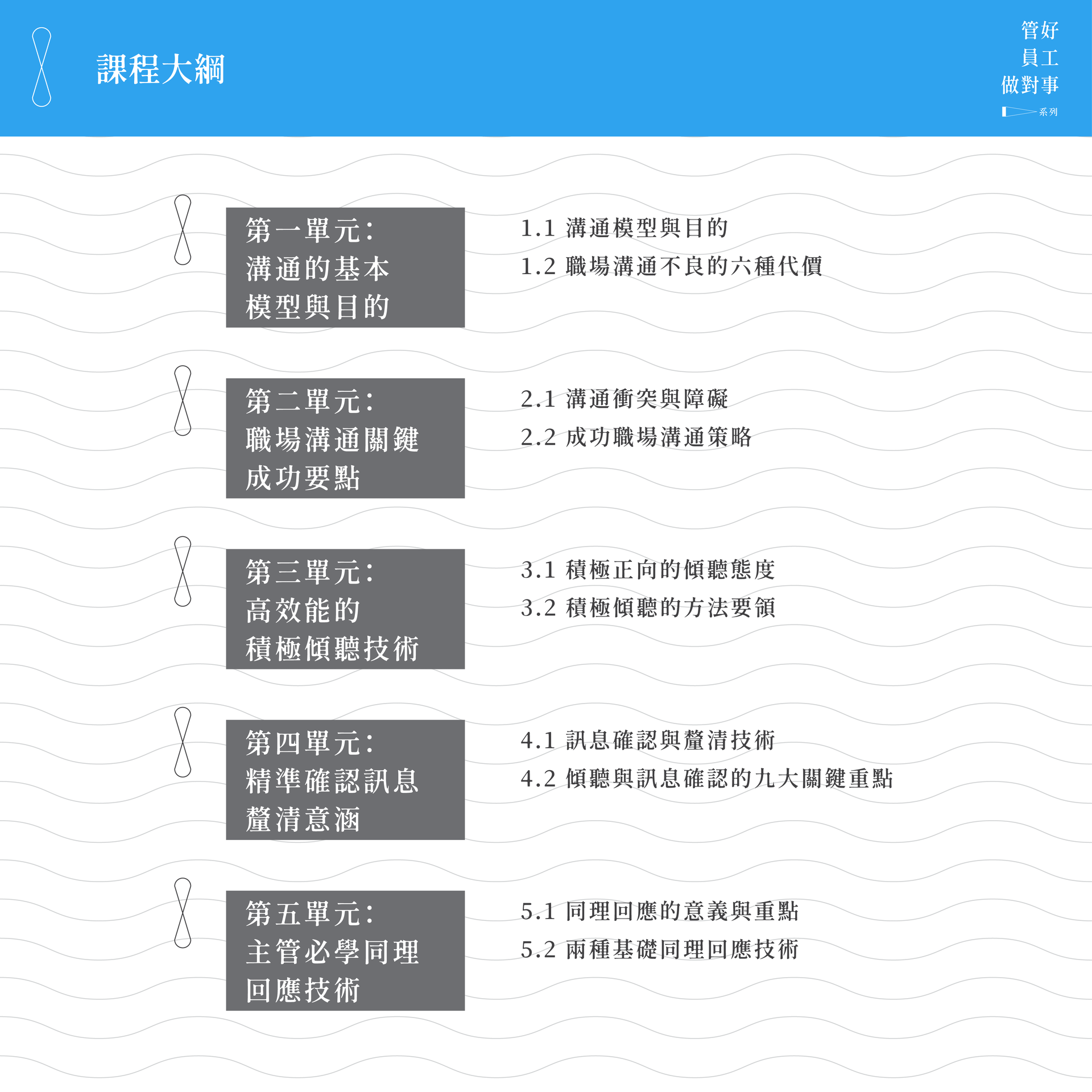 【完整時長約為1.5hr】工作無法單打獨鬥,但要如何帶領好團隊,不是件容易的事!「溝通協調力」是身為主管的必備技能!本堂課將以企業實務為導向,搭配實用工具表單,一步步學會掌握傾聽技術、溝通方法以及溝通品質,上完可立即應用在自己的管理工作中!