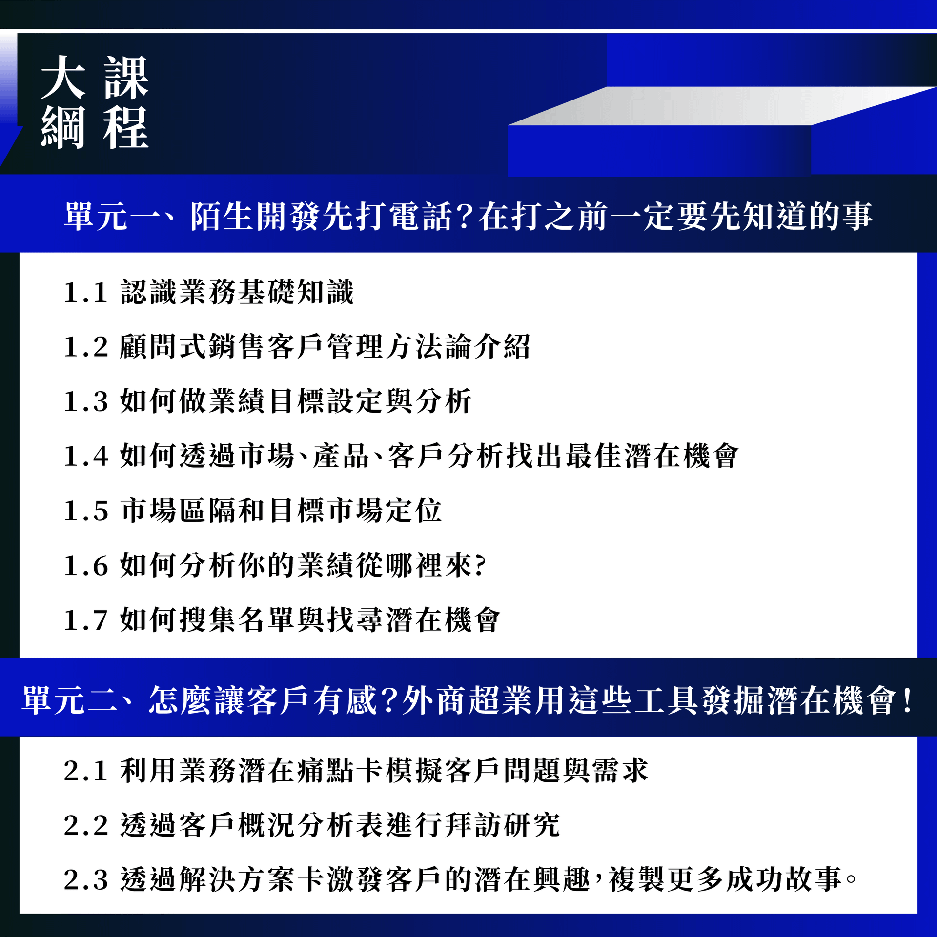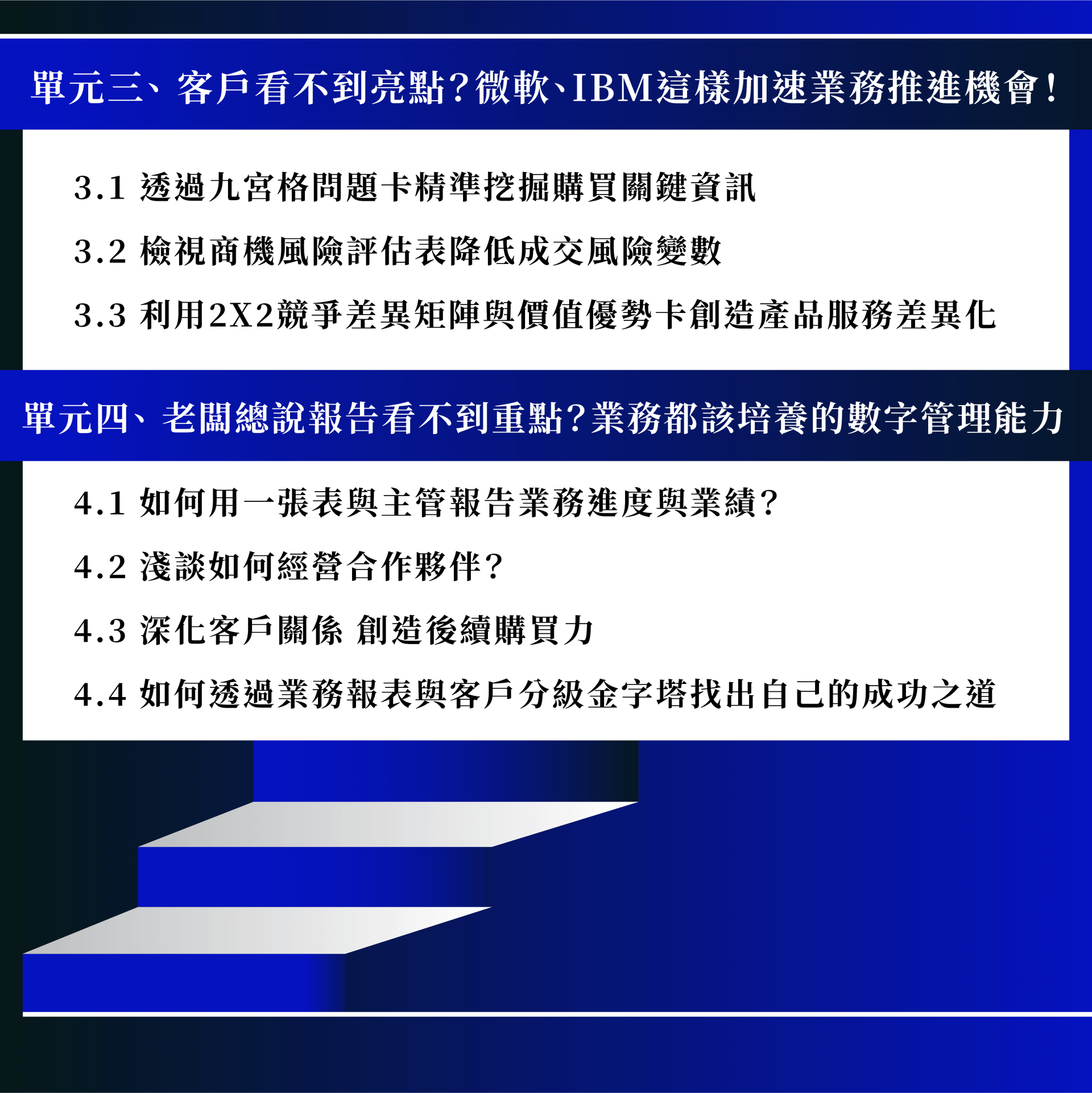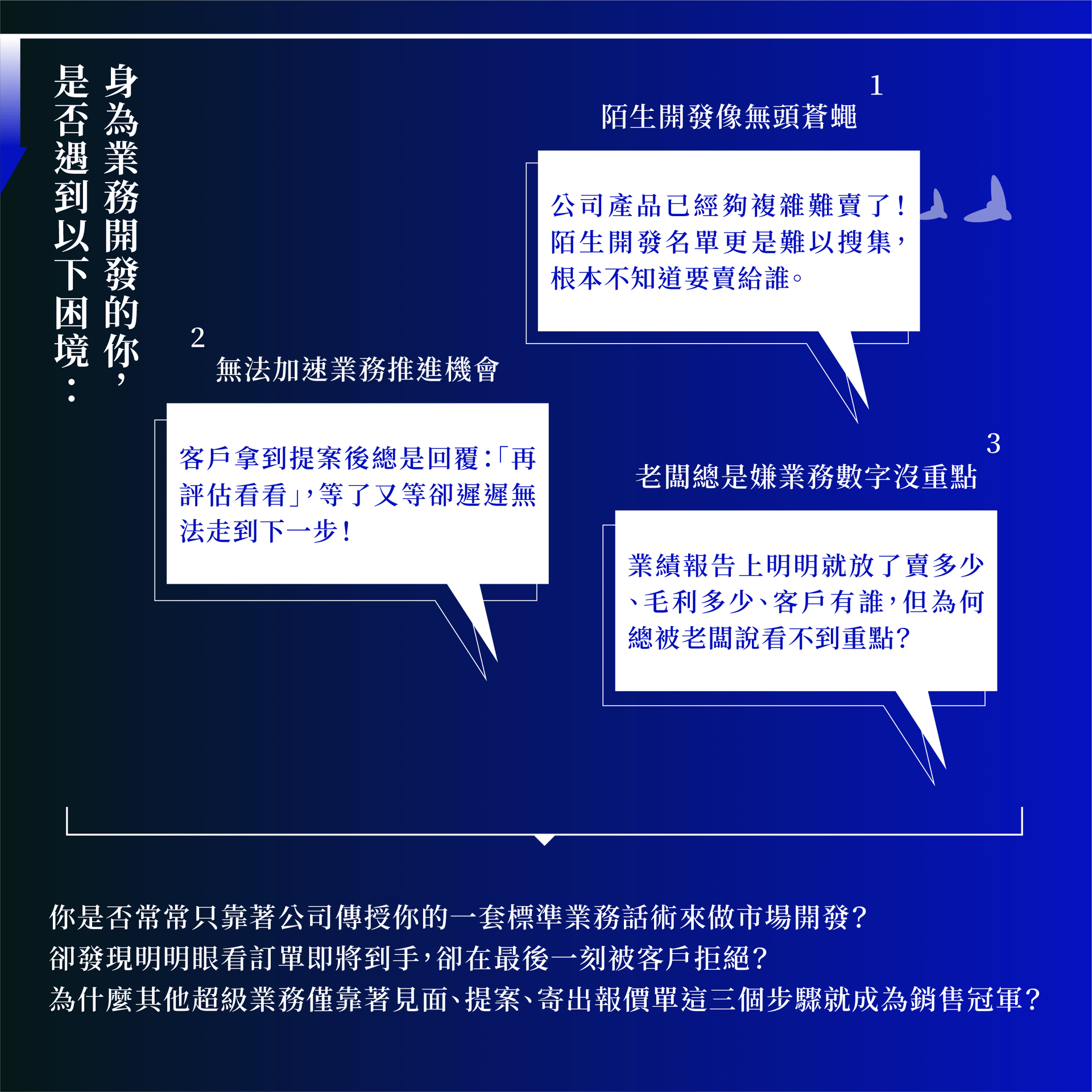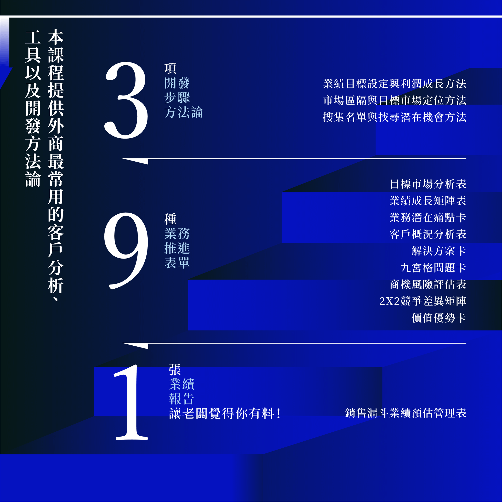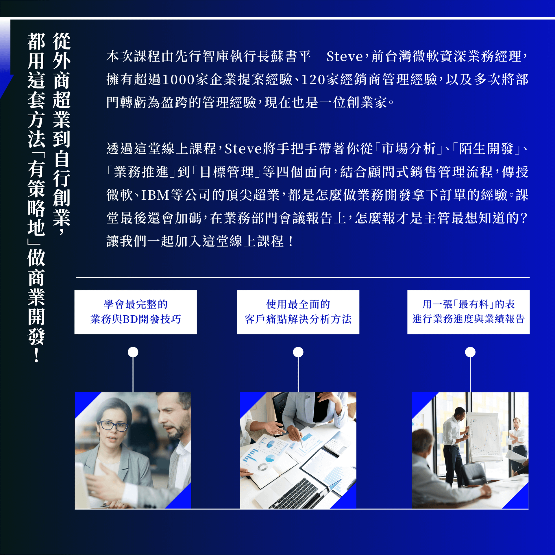 【本課程完整時長約為3hr】再複雜的產品,都能有「步驟」的開發業務!微軟、IBM都在用的3項開發步驟 X 9種業務推進表單 X 1張內部業績報告表,讓你學到世界級的頂尖銷售,是如何成為超級業務的制勝法則!