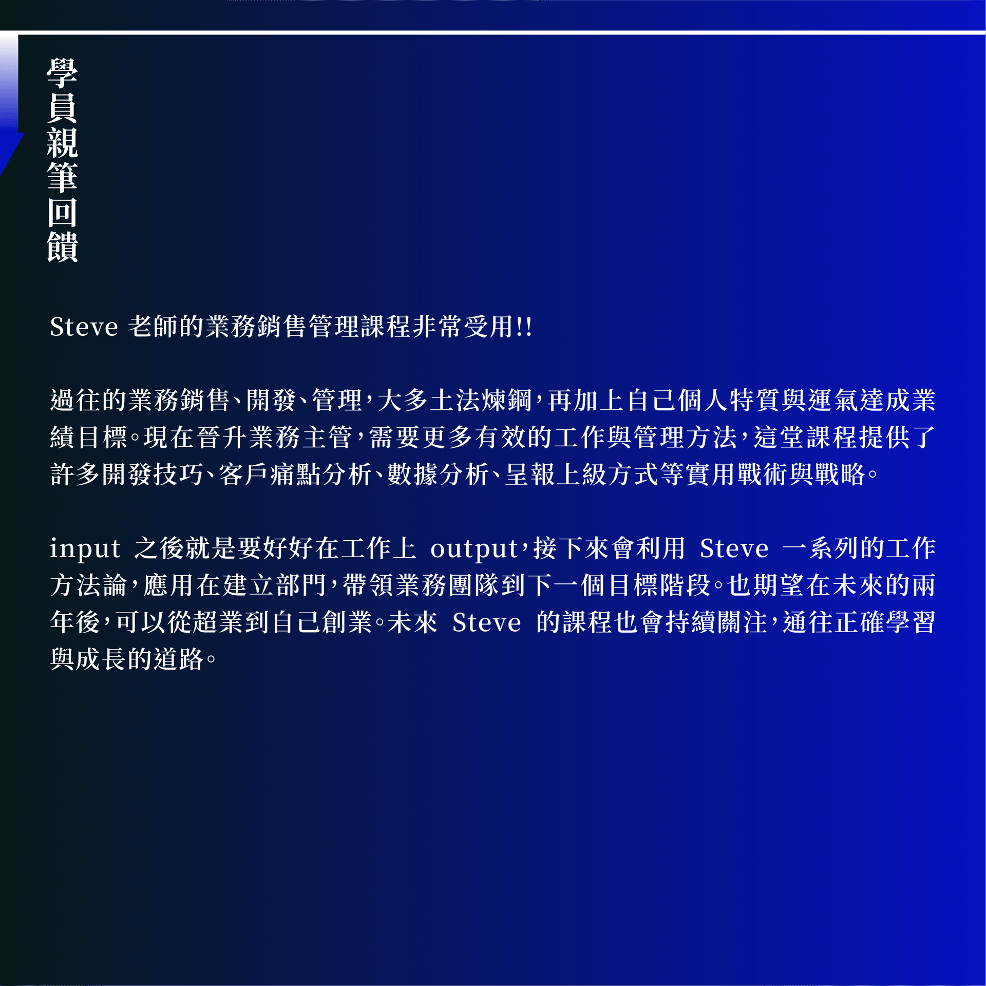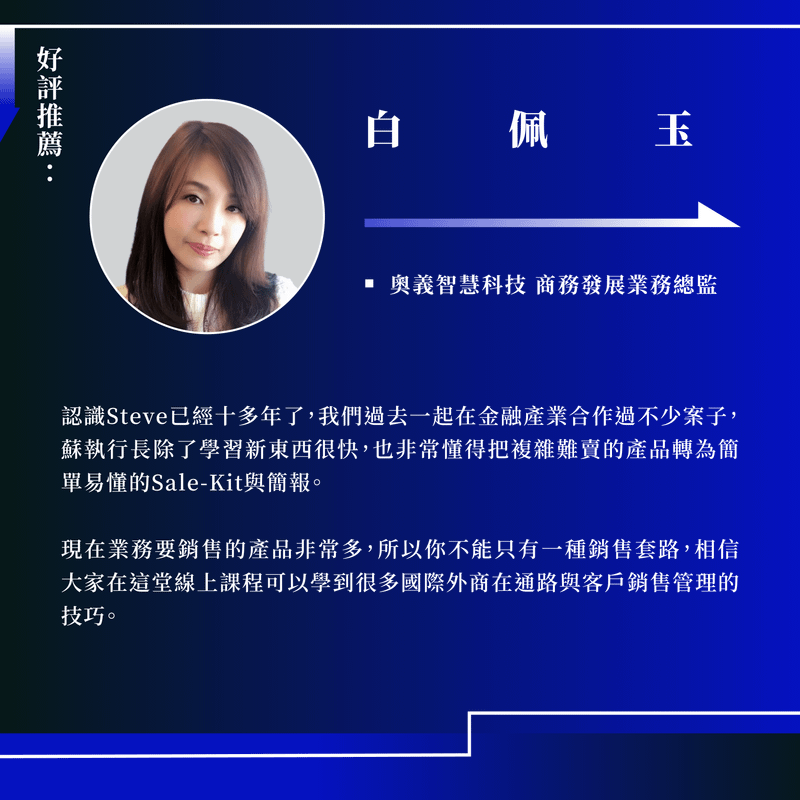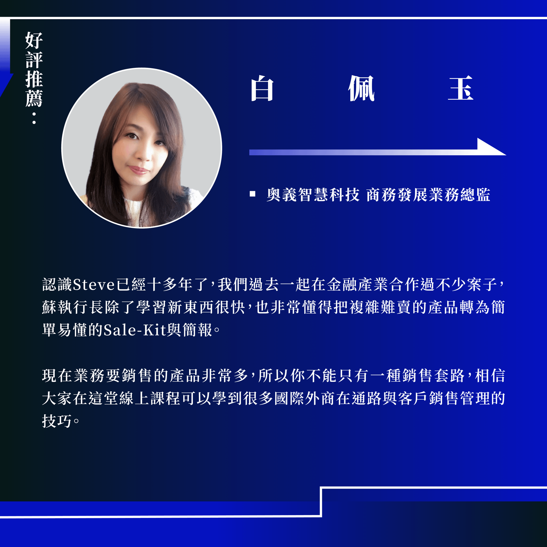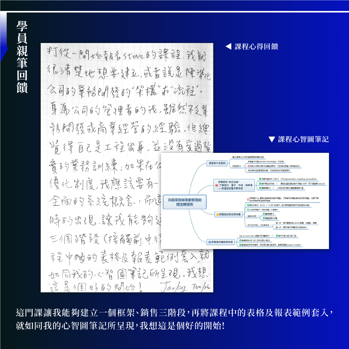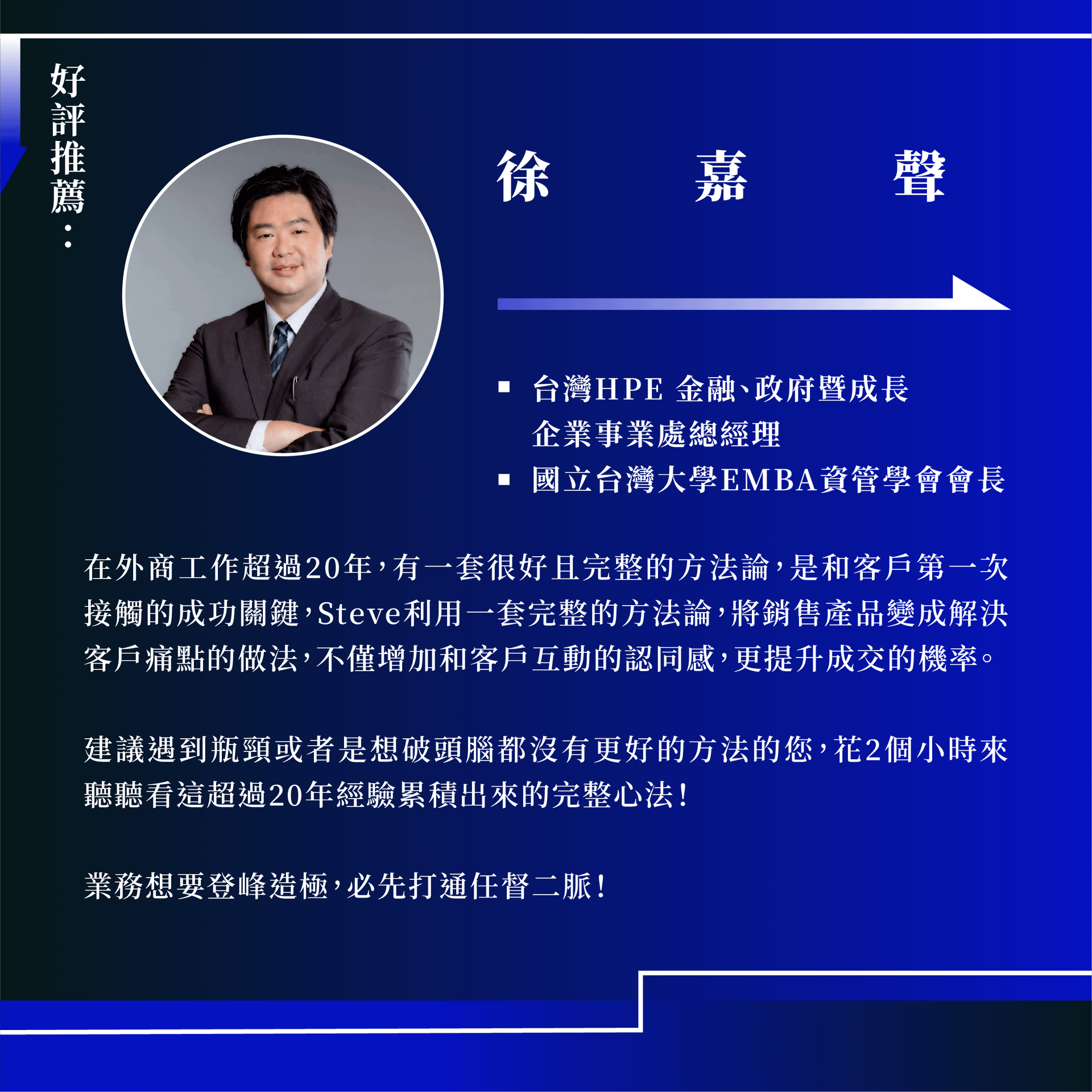 【本課程完整時長約為3hr】再複雜的產品,都能有「步驟」的開發業務!微軟、IBM都在用的3項開發步驟 X 9種業務推進表單 X 1張內部業績報告表,讓你學到世界級的頂尖銷售,是如何成為超級業務的制勝法則!