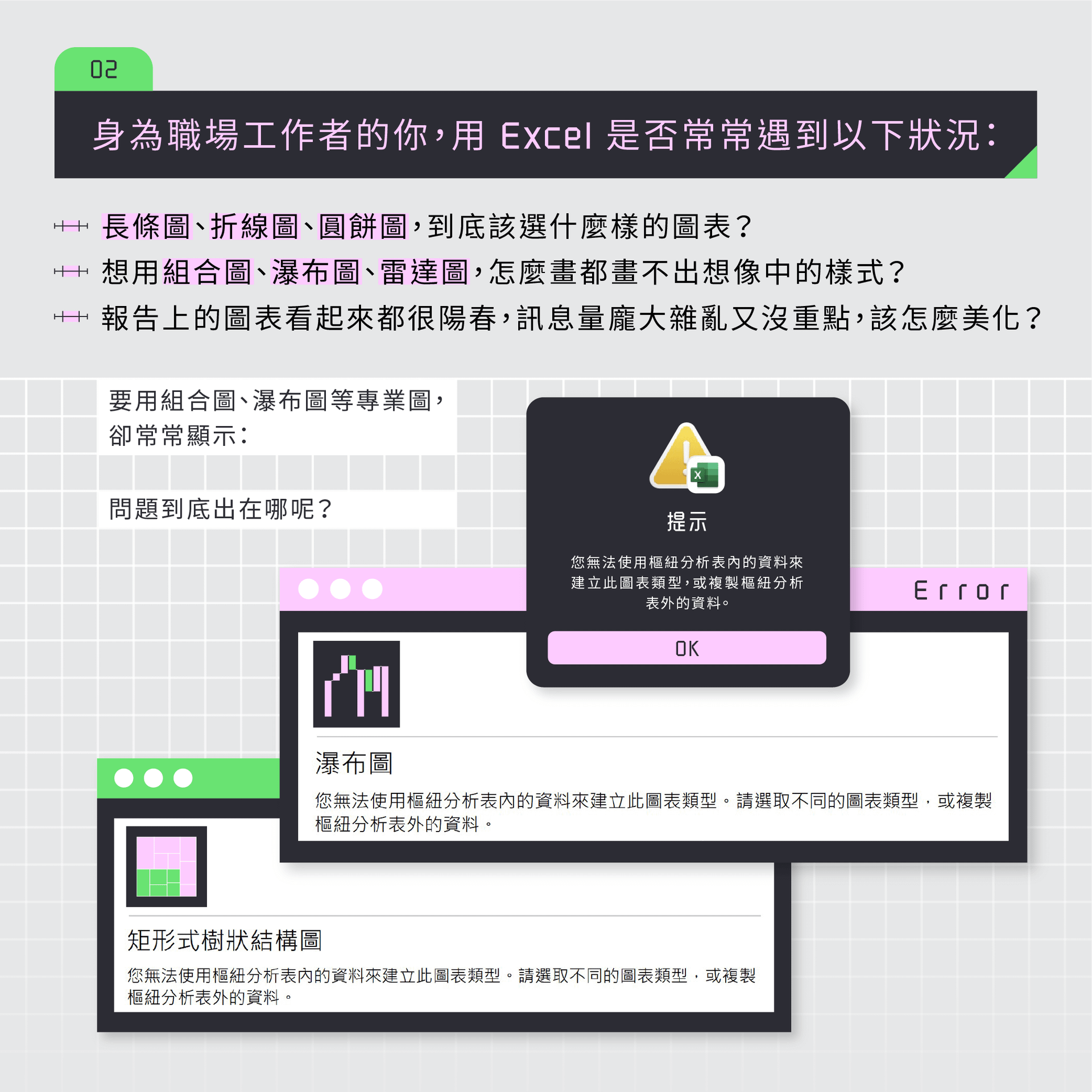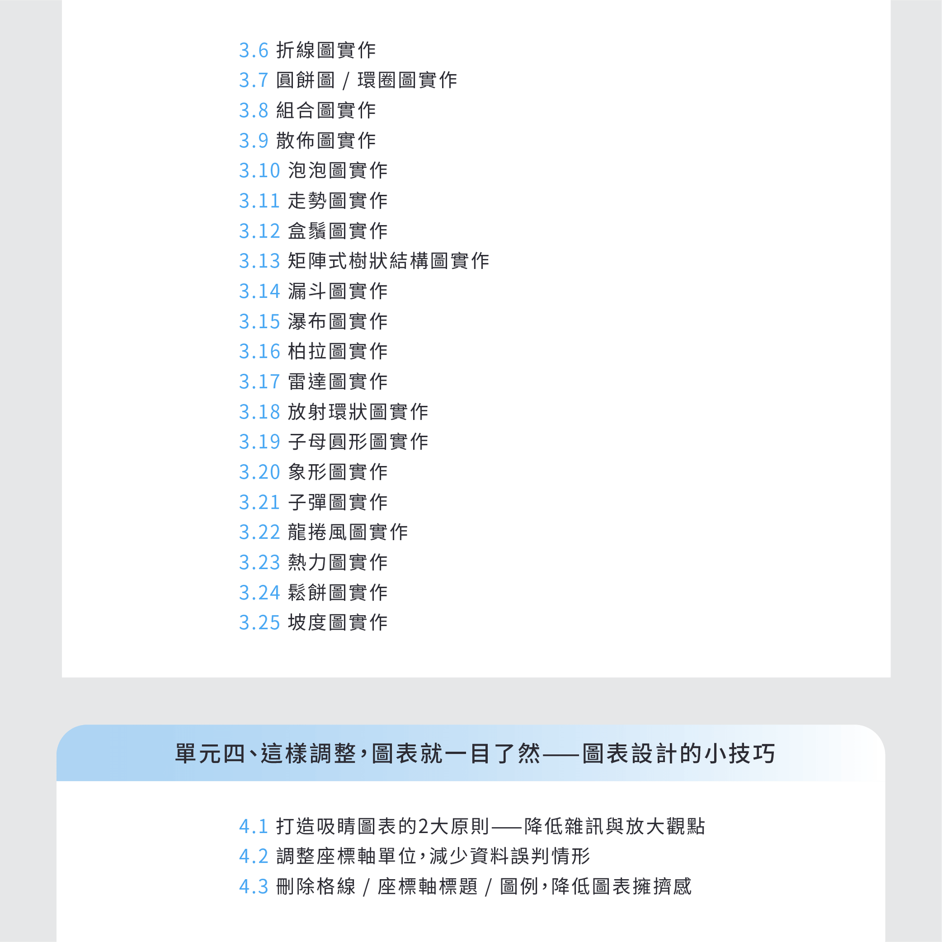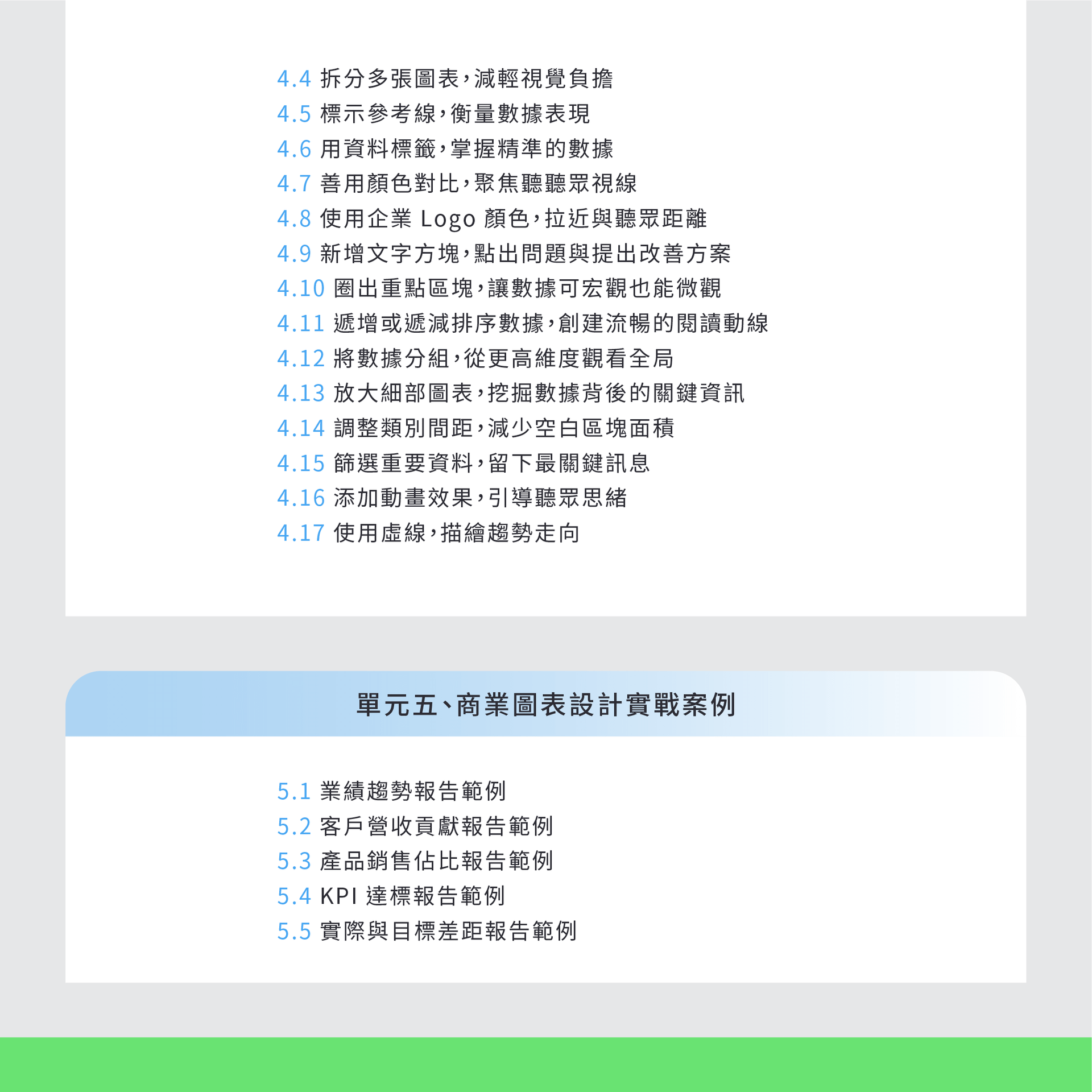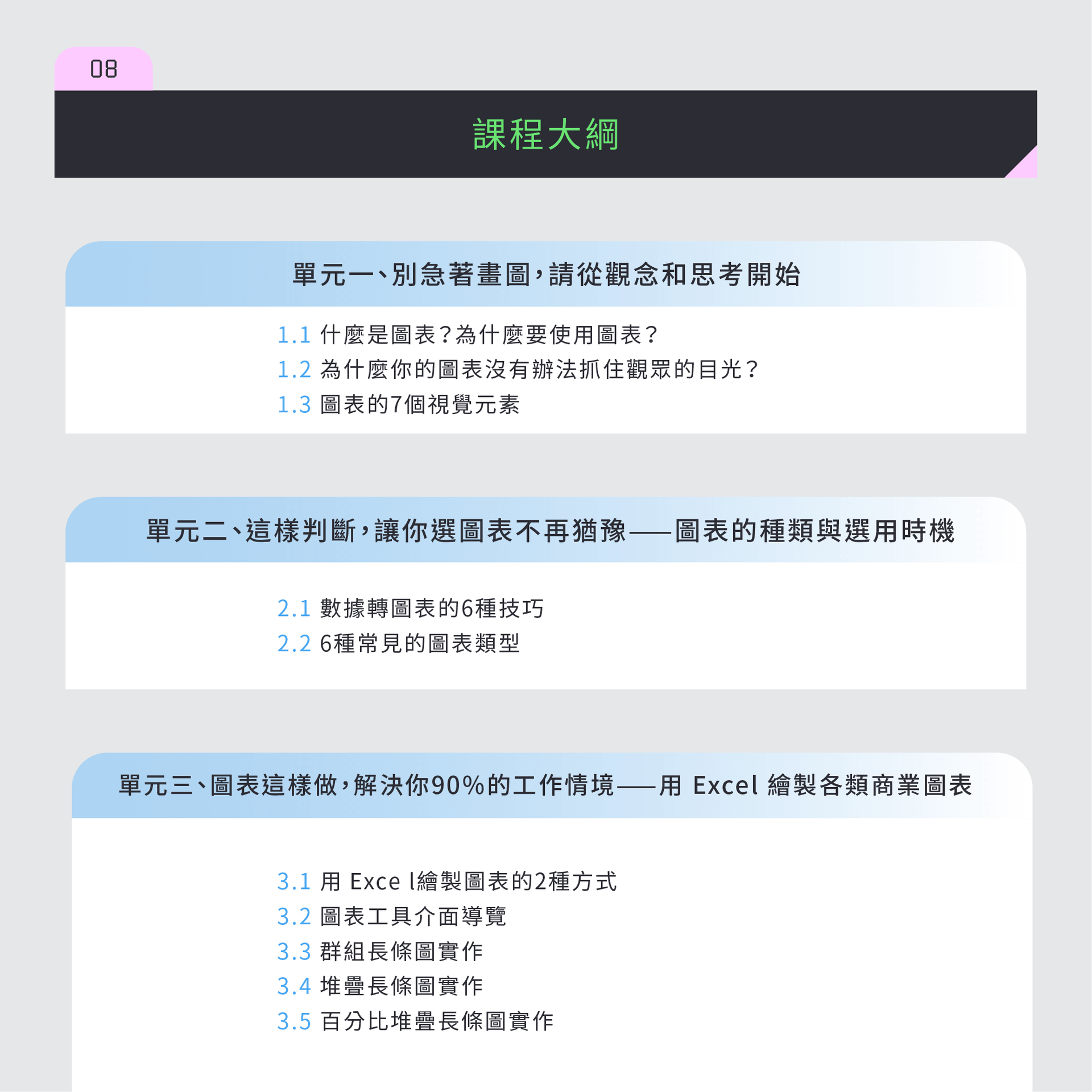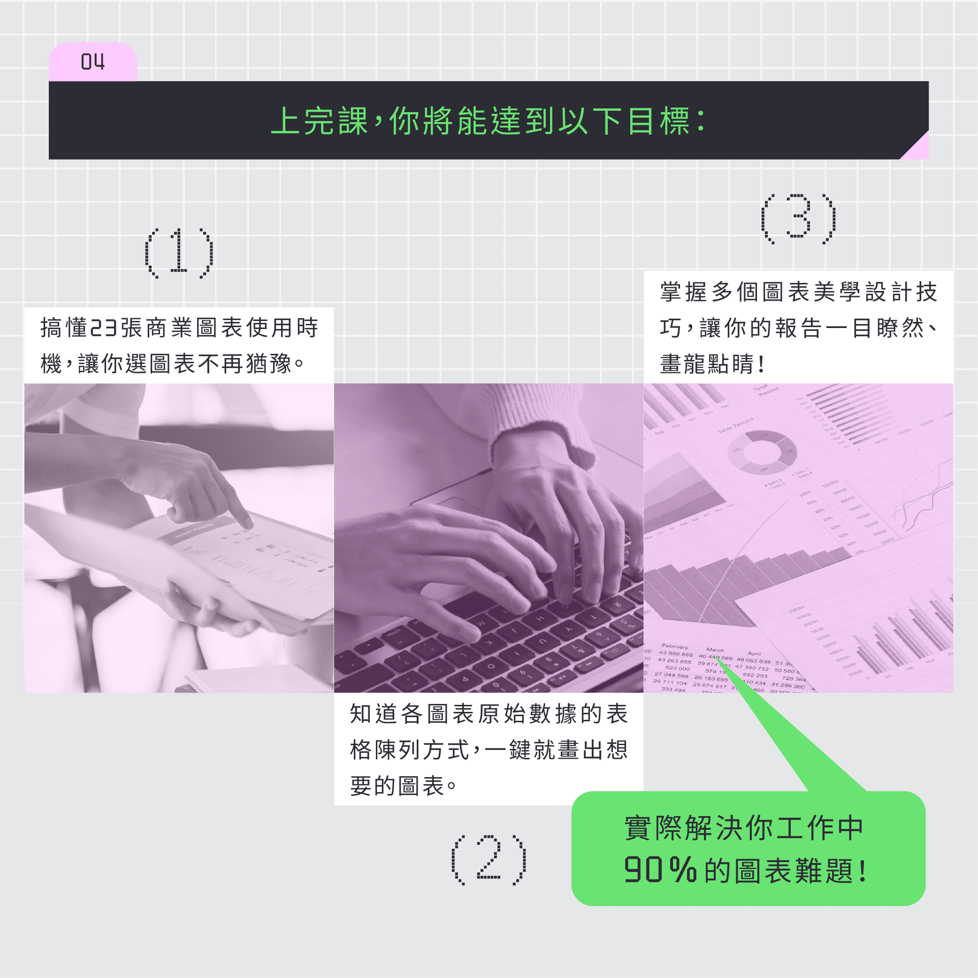 課程2.3小時,不清楚各種圖表的使用時機、難以讓讀者把目光聚焦在重點項目該怎麼辦?