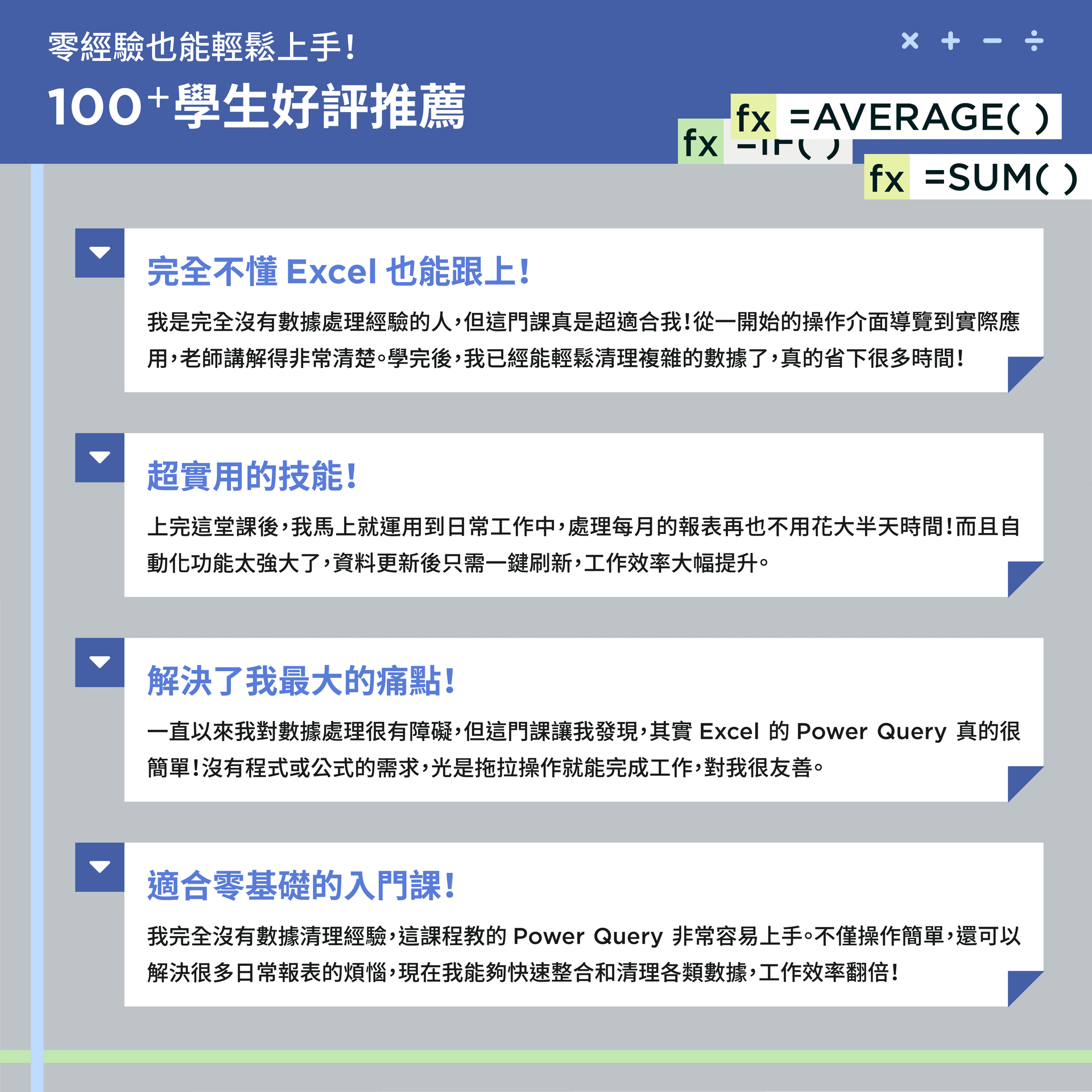 透過 Power Query 的強大功能,只需幾個簡單的步驟,就能自動化處理複雜的數據清理任務。這意味著你可以把精力集中在數據分析和決策上,而不浪費時間在技術細節或學習程式語言上。這樣的無壓力學習方式,適合需要快速提升 Excel 能力的學員,讓工作效率倍增。