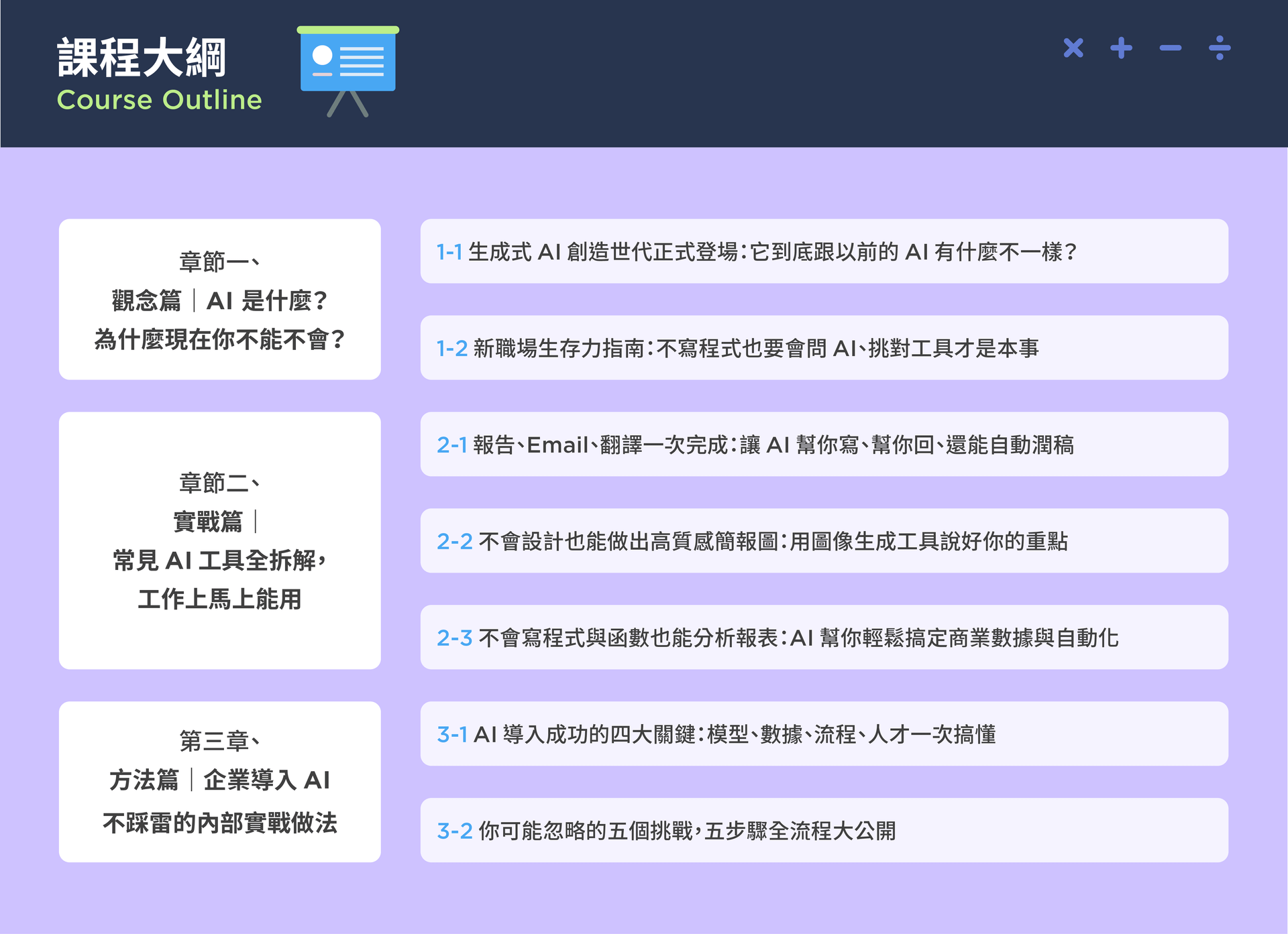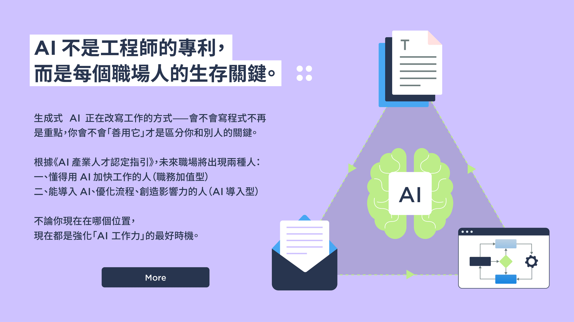 在 AI 共事時代,懂得操作只是基本,你還會學到怎麼問對問題、搭配場景選工具、產出可見成果。這些能力會默默讓你成為部門裡最被信賴的問題解決者。