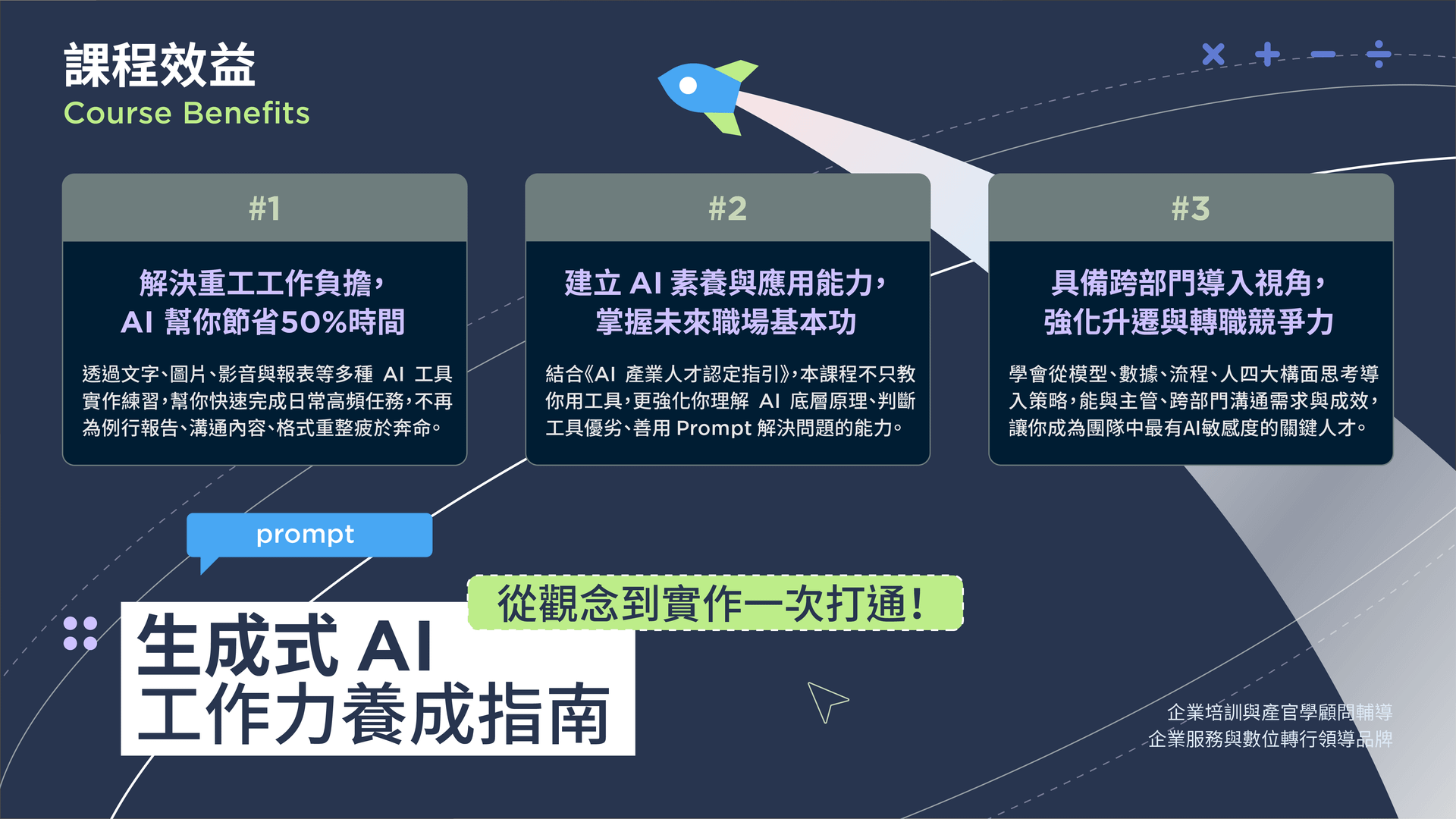 不只你自己快,還能帶著團隊一起更順。你會知道怎麼用 AI 加速資料整合、溝通準備與報告交付,讓主管安心、同事跟上、流程流動得更快。