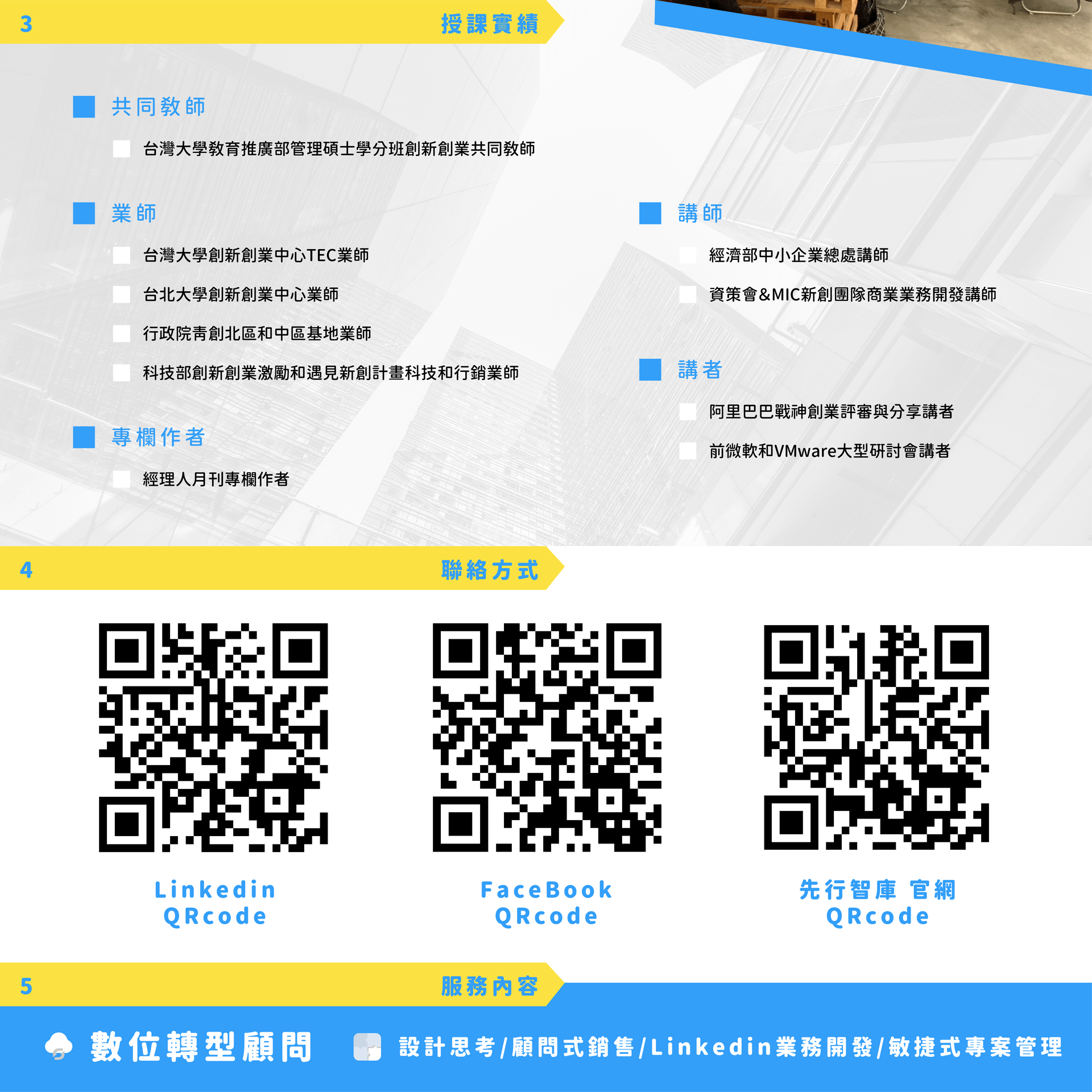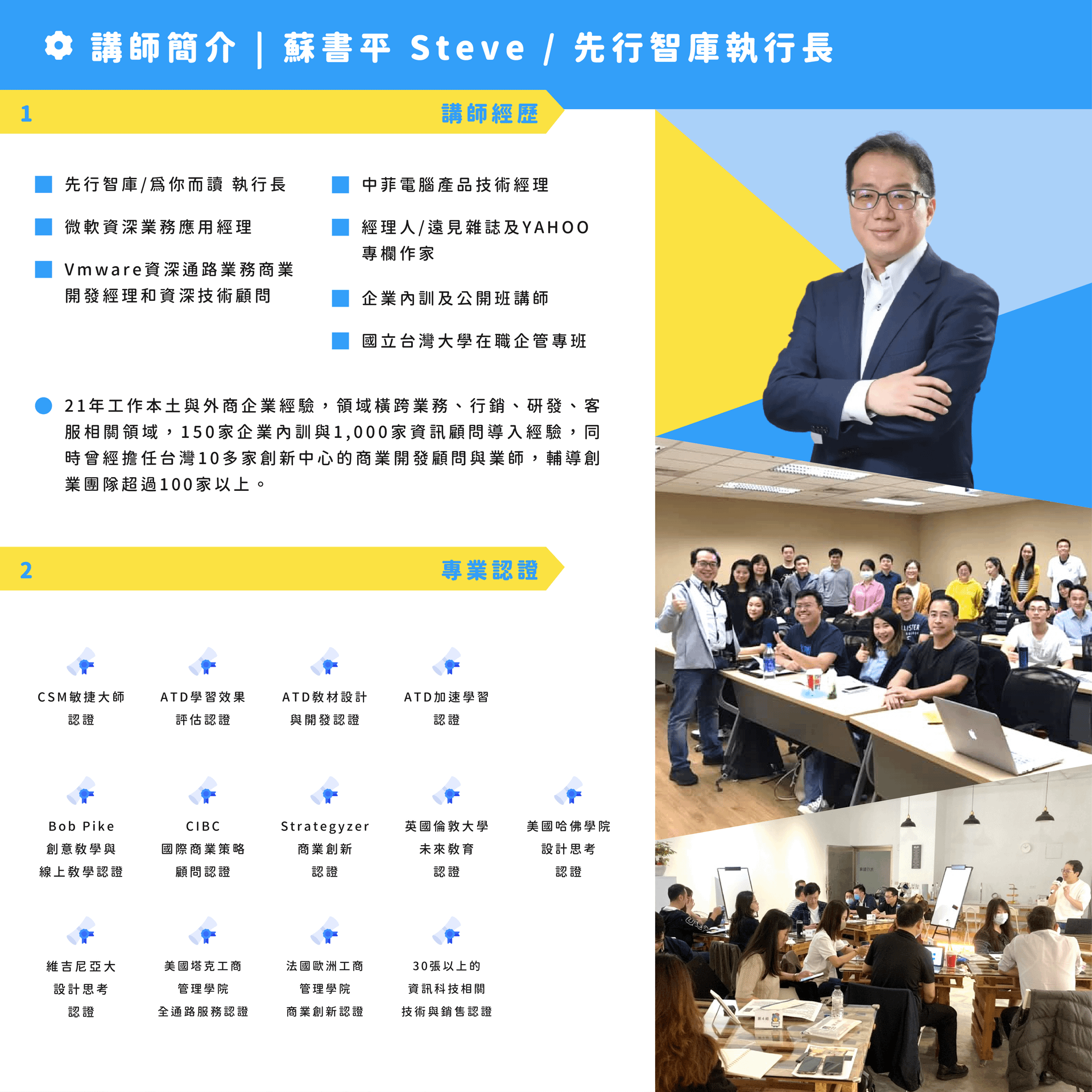 過去曾任微軟資深業務應用經理和VMware資深通路業務商業開發經理和資深技術顧問。21年工作本土與外商企業經驗,領域橫跨業務、行銷、研發、客服相關領域,超過300家以上的企業內訓與商業創新顧問導入經驗。同時曾經擔任台灣10多家創新中心的商業開發顧問與業師,輔導創業團隊超過100家以上。