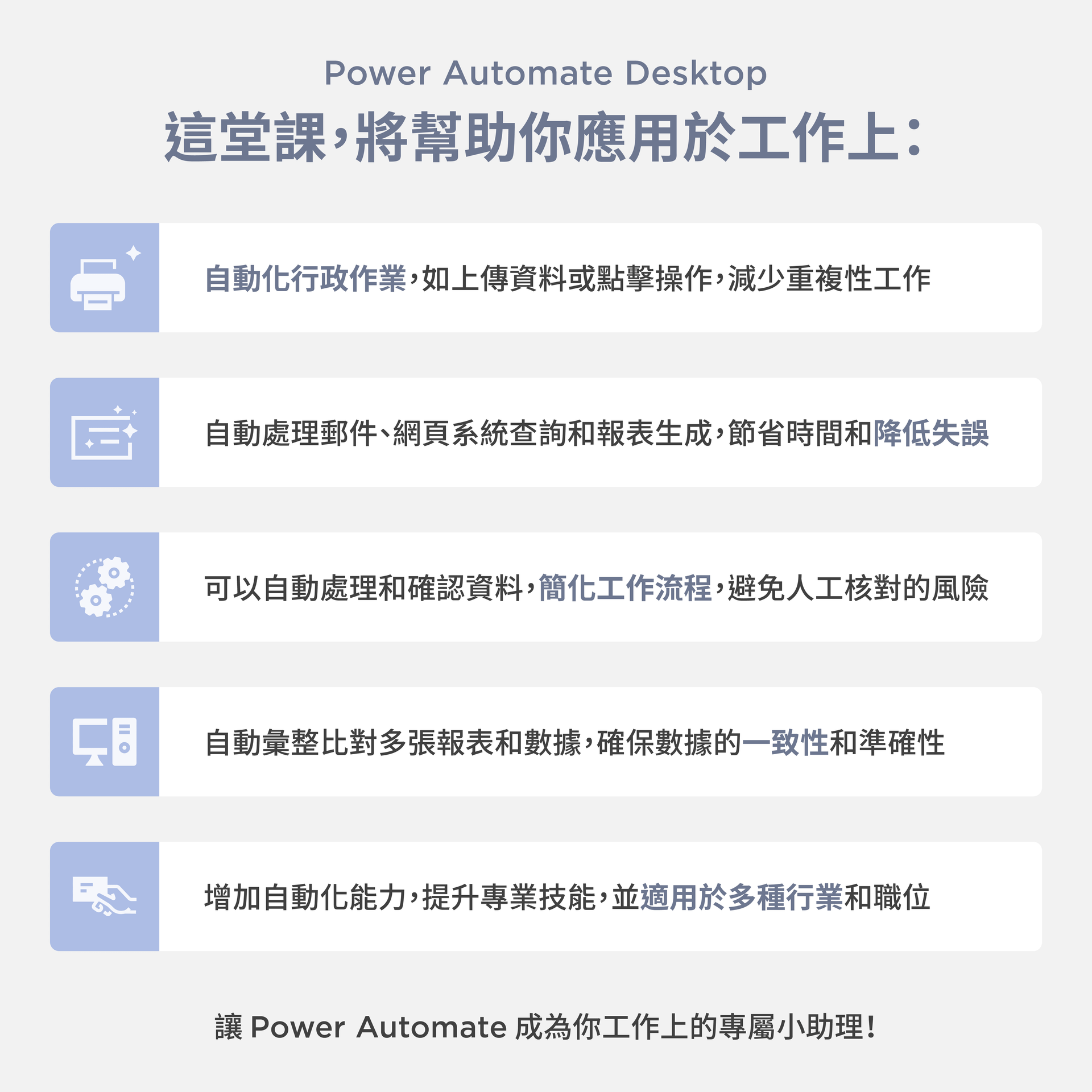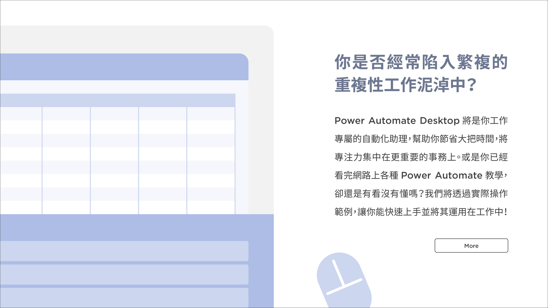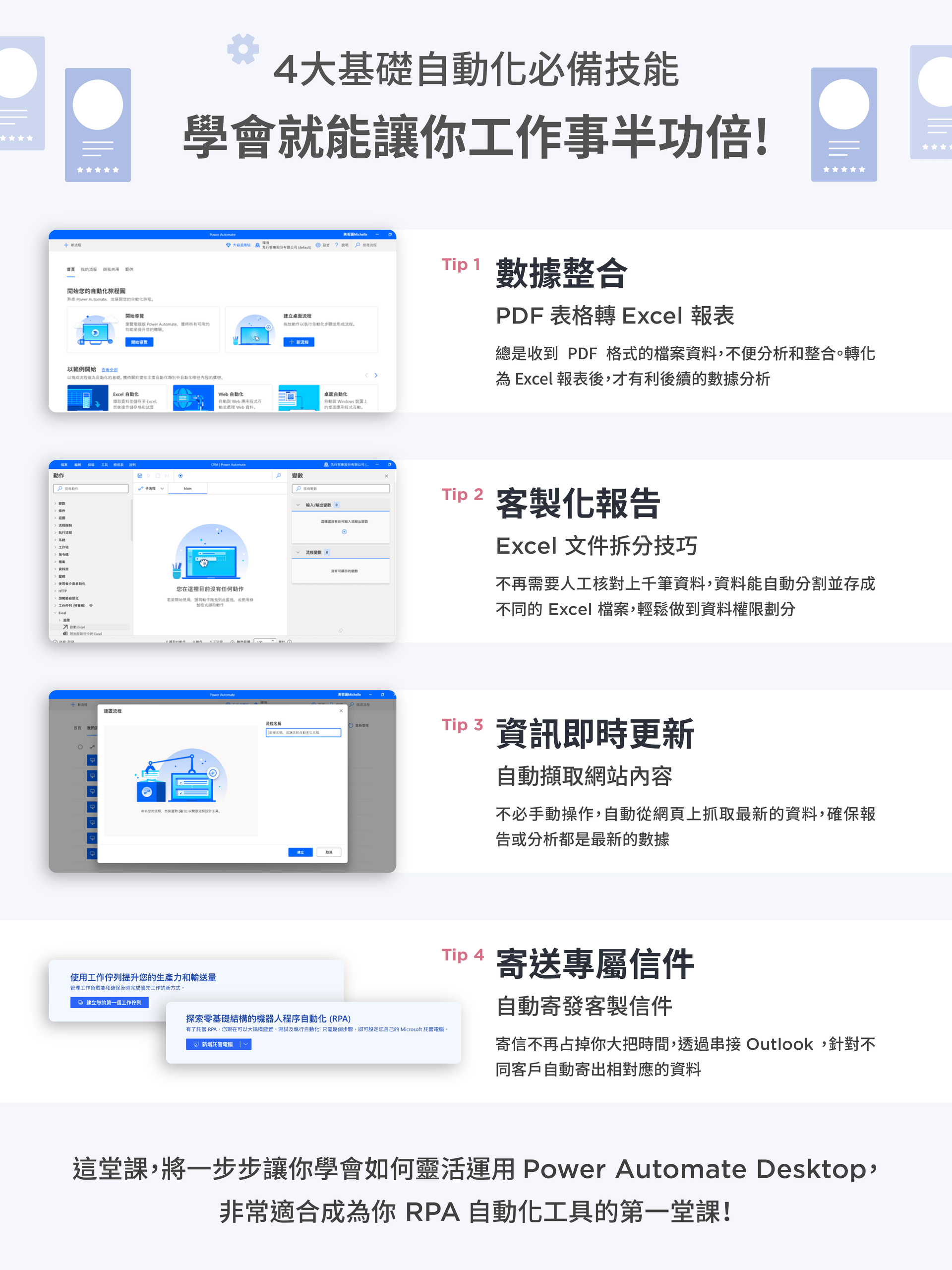 你是否經常陷入繁複的重複性工作泥淖中?Power Automate Desktop 將是你工作專屬的自動化助理,幫助你節省大把時間,將專注力集中在更重要的事務上。或是你已經看完網路上各種 Power Automate 教學,卻還是有看沒有懂嗎?我們將透過實際操作範例,讓你能快速上手並將其運用在工作中!