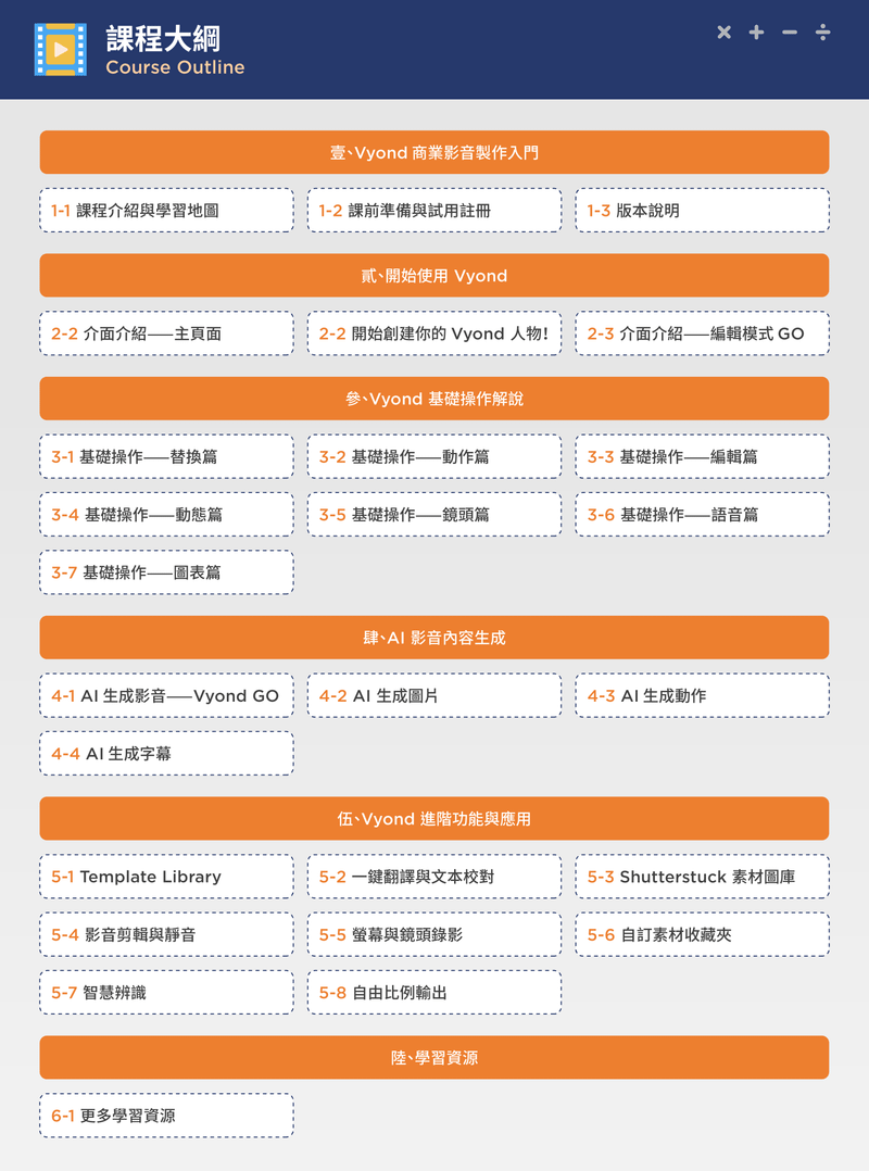 2. 熟悉 Vyond 核心介面與工作流程:建立影片檔案管理、場景搭建與內容規劃的基礎操作能力。