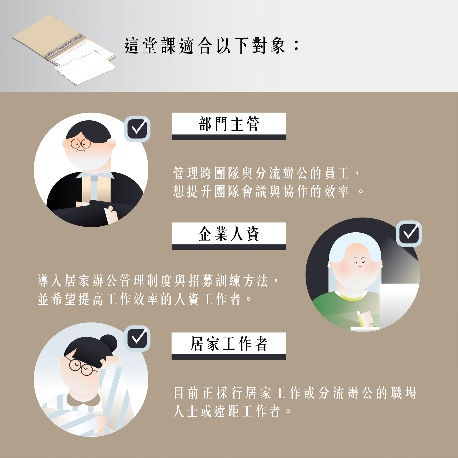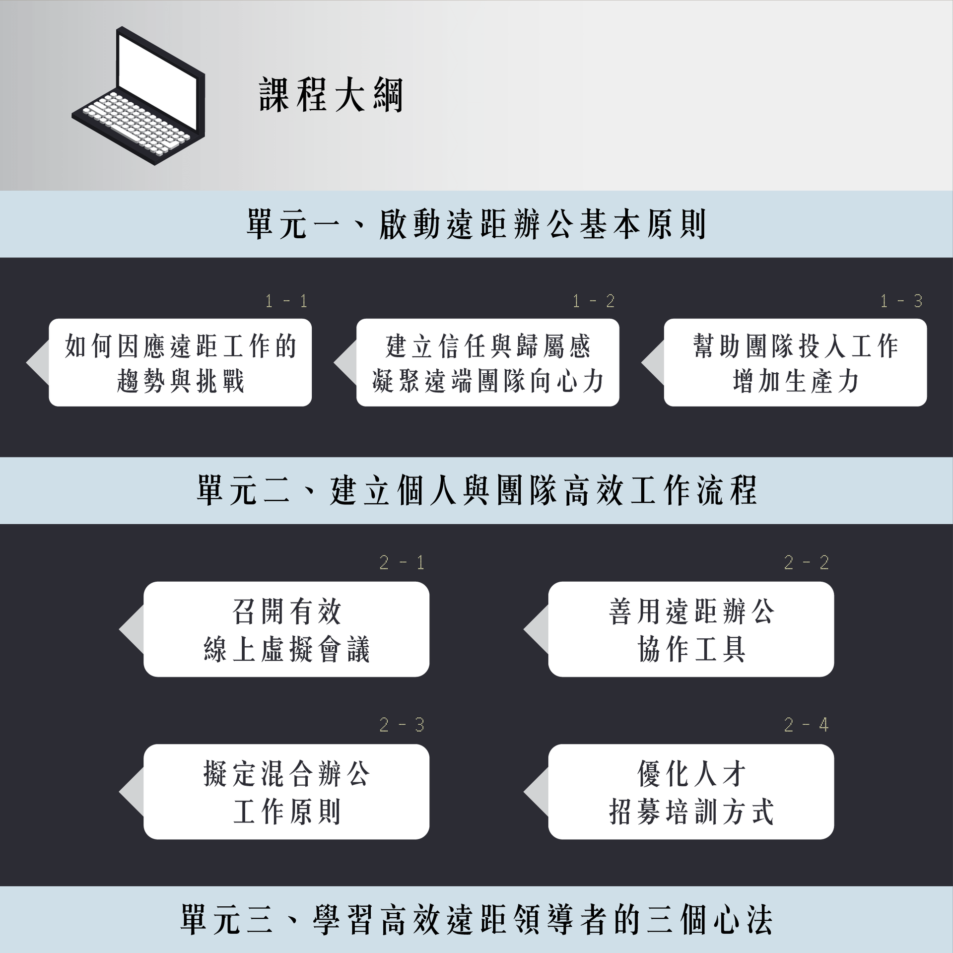【課程完整時長約1.1hr】本課程協助混合團隊管理者、遠距工作者創造高品質兼高效率的混合工作技巧。帶你掌握後疫情時代最需要具備的工作技能,提升你在數位轉型浪潮下的職場競爭力!