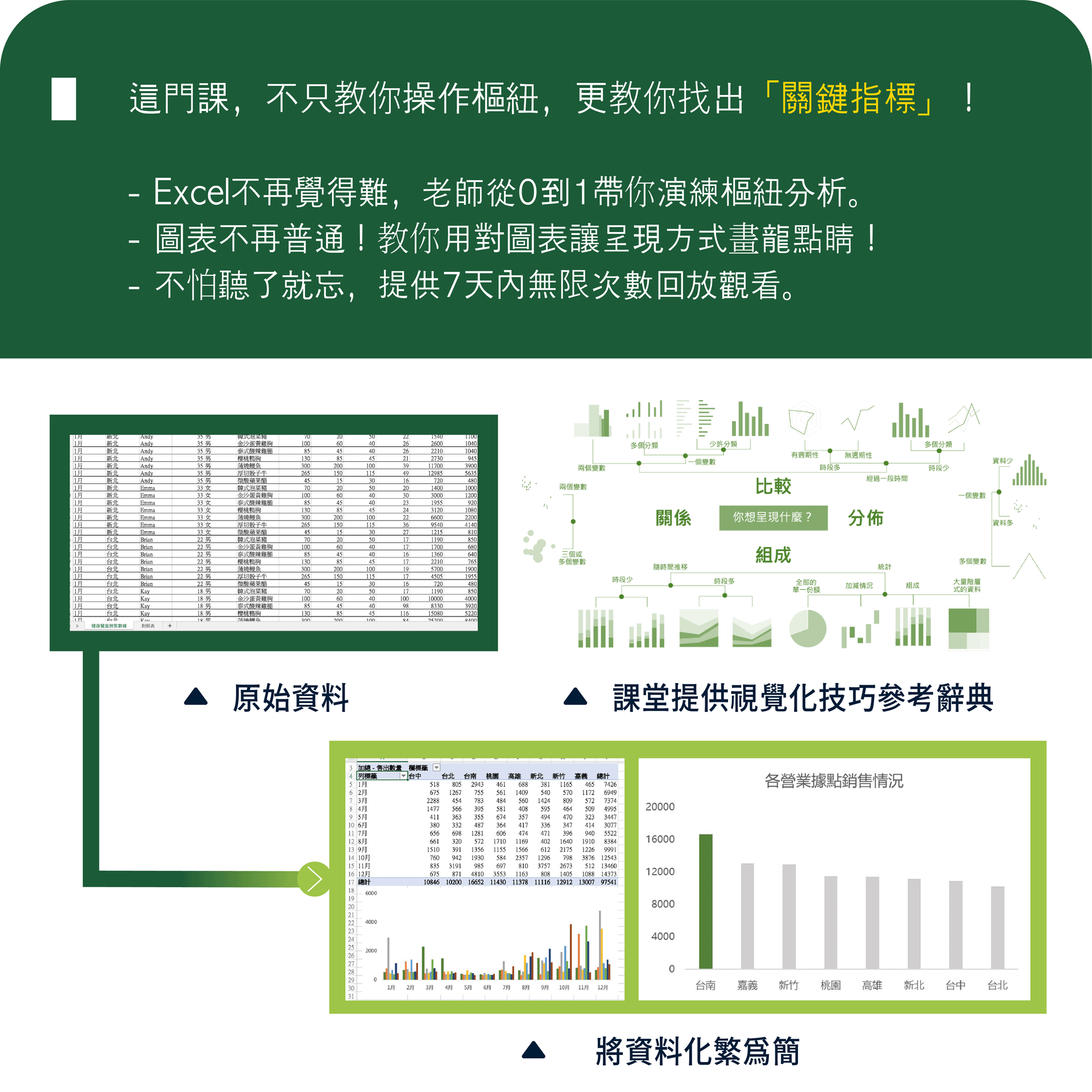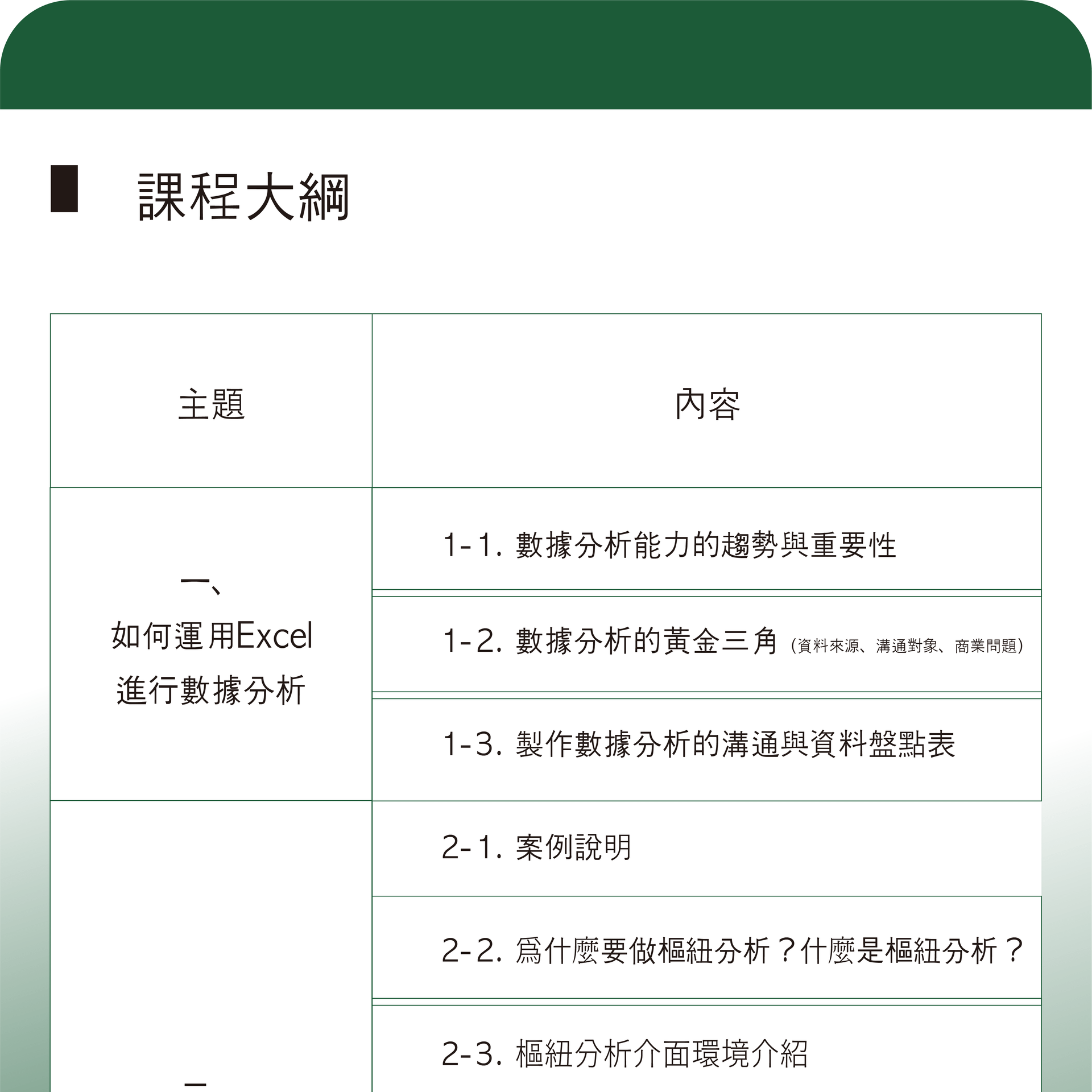 搭配情境式、主題式、漸進式的教學手法,用系統化的方式協助解決資源彙整、數據清理、視覺化、分析手法等問題。