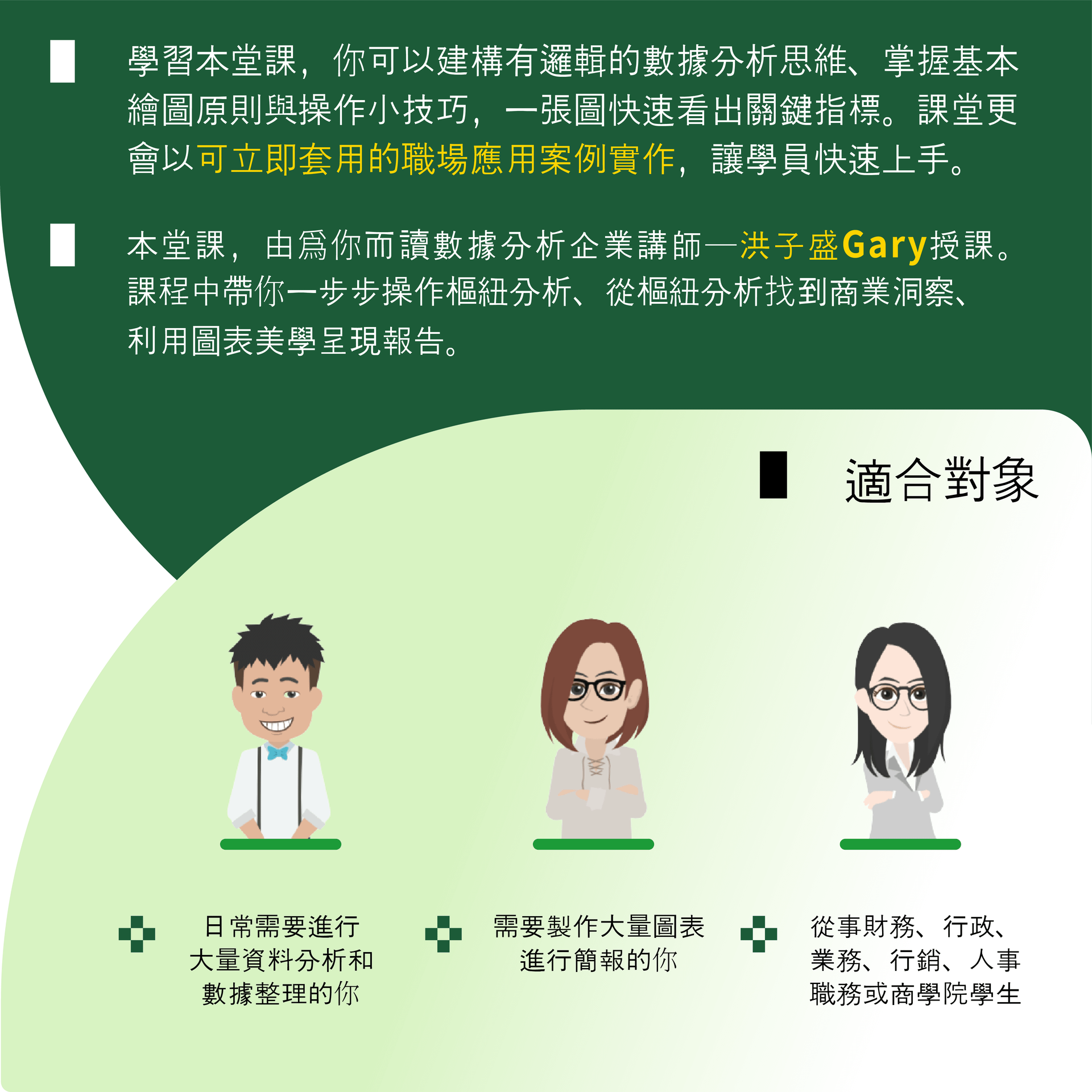 先行智庫專案管理部|經理、數據分析|專任講師/顧問擅長從客戶的問題出發,以終為始,設計客製化的數據分析課程。