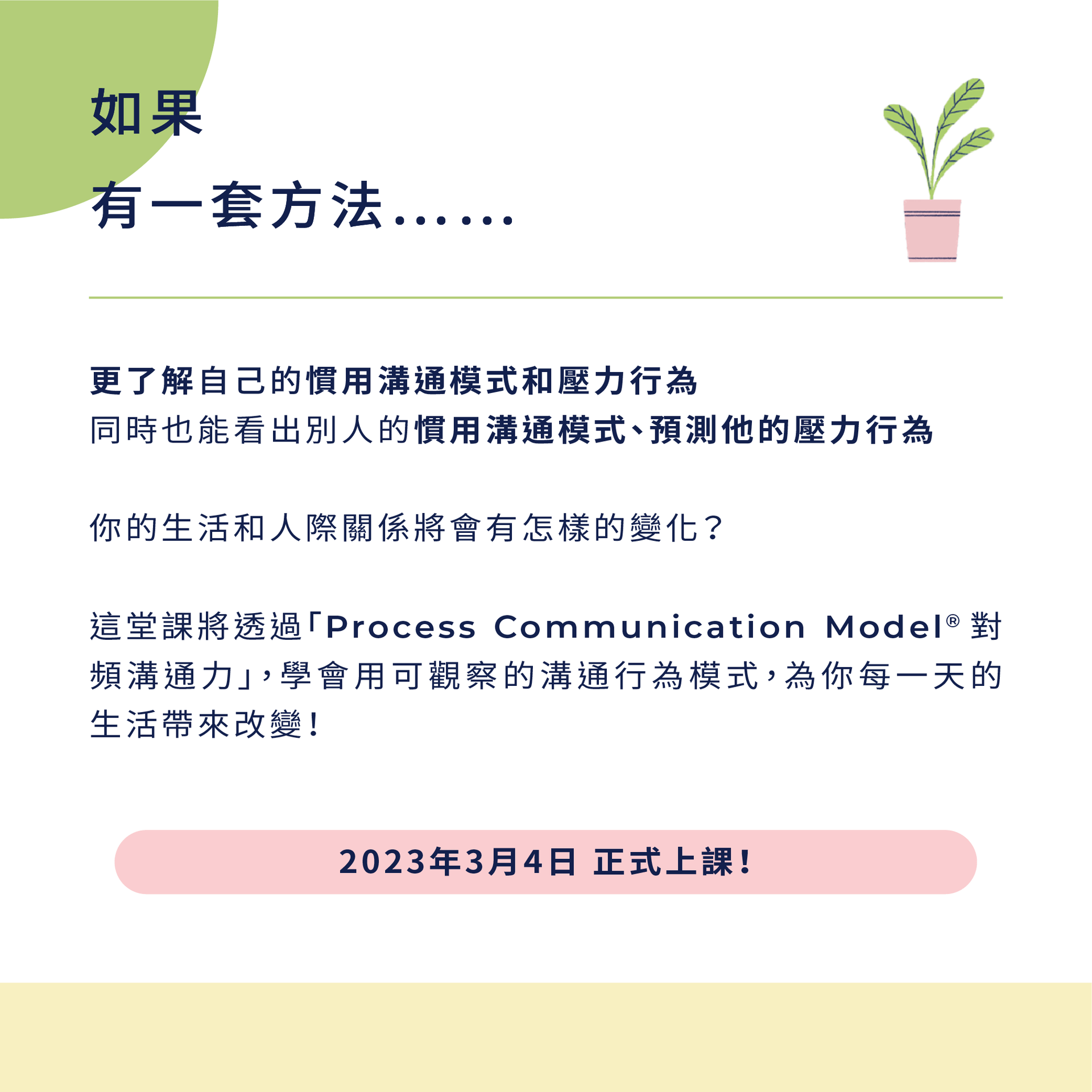 報名後,將會在三個工作天內寄發「PCM溝通性格評測使用說明」Email給您,並依照指示,線上完成全英文的問卷填答 (需時約45分鐘)。評測結果及完整報告,將於第一單元的課堂上,由講師透過Email寄發。
