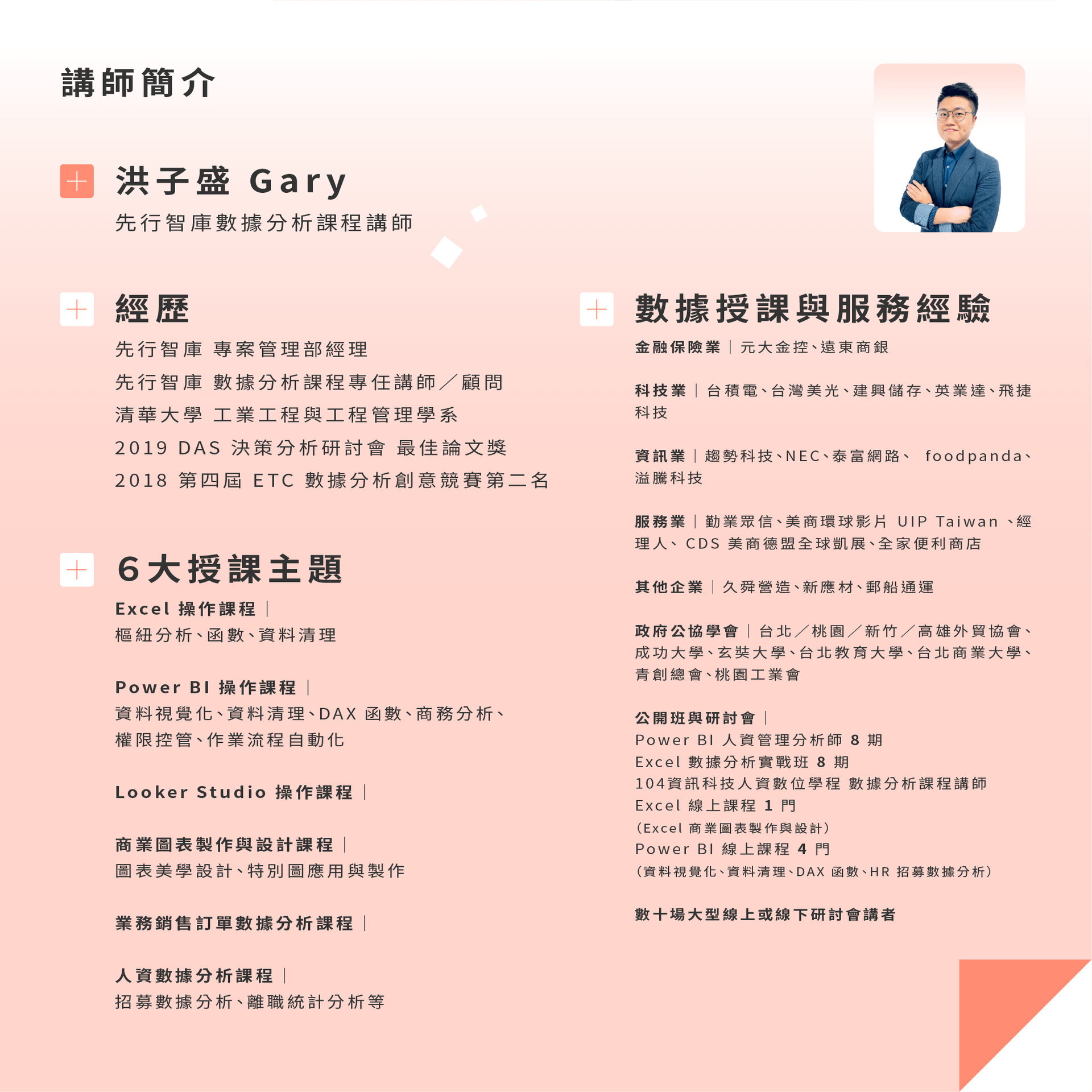 先行智庫專案管理部|經理、數據分析|專任講師/顧問擅長從客戶的問題出發,以終為始,設計客製化的數據分析課程。